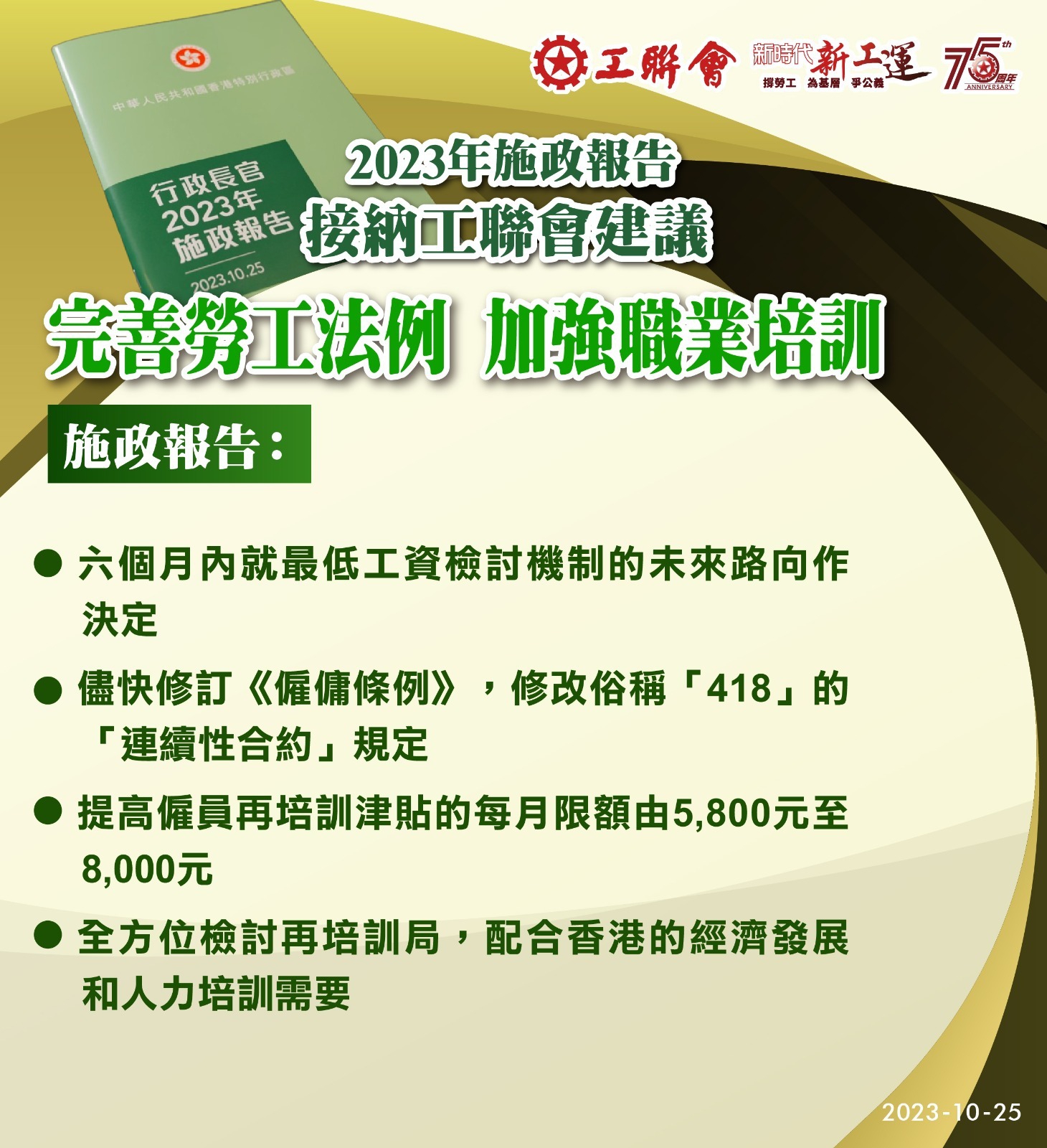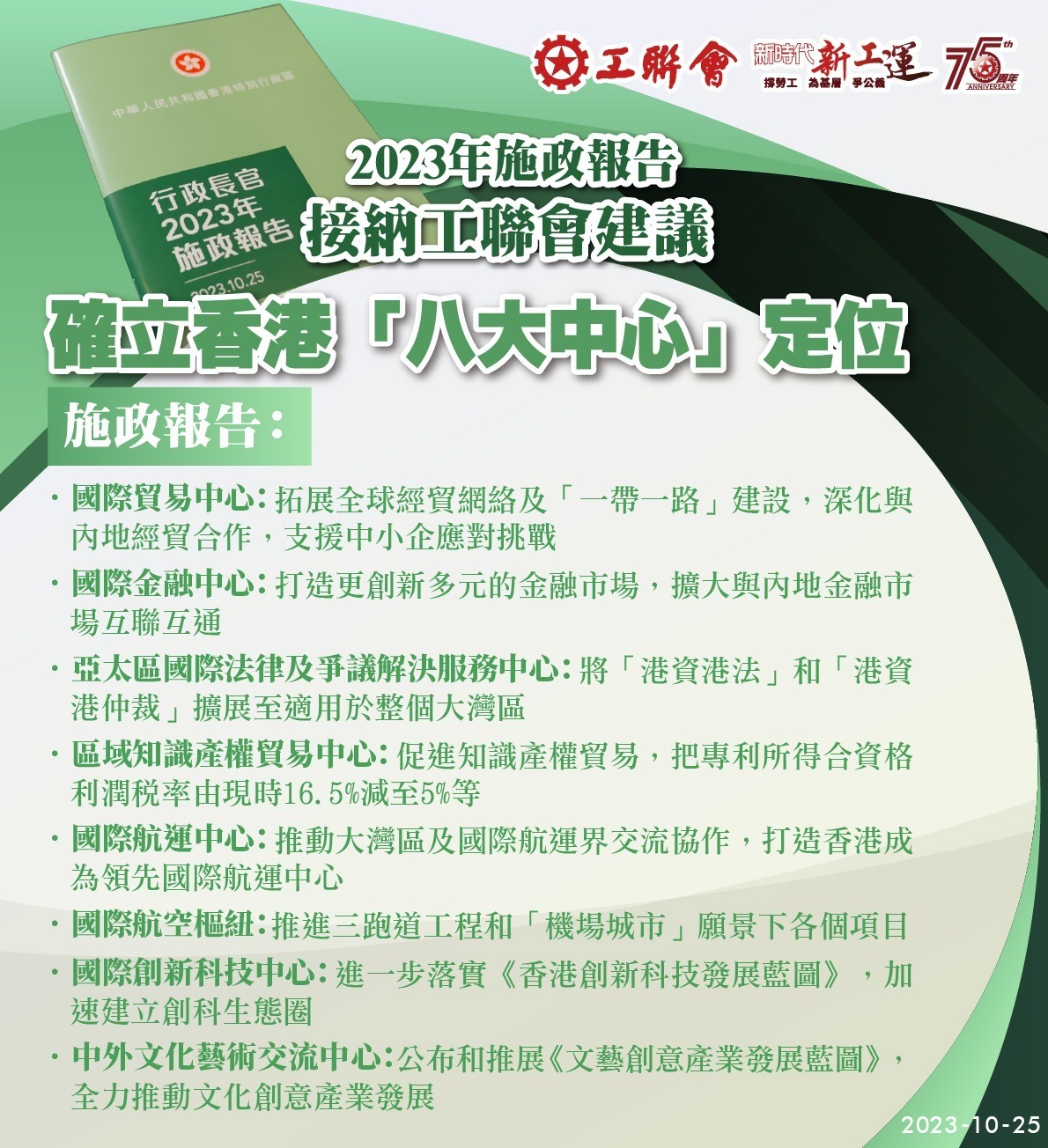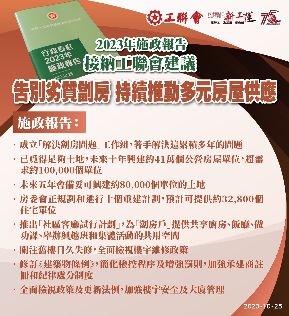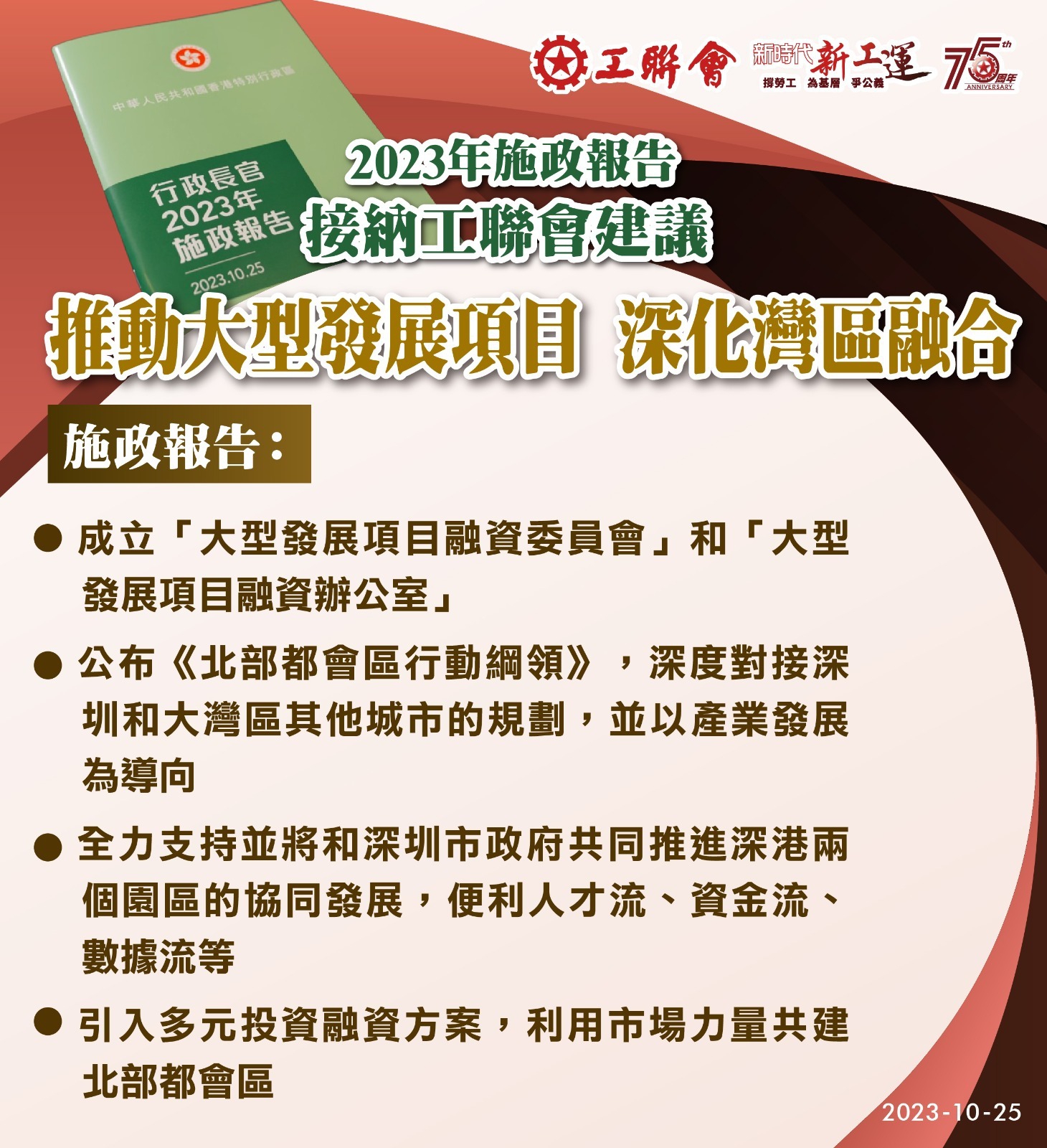 2023-10-25 工聯會歡迎特首李家超《2023年施政報告》從善如流 措施全面 增強信心