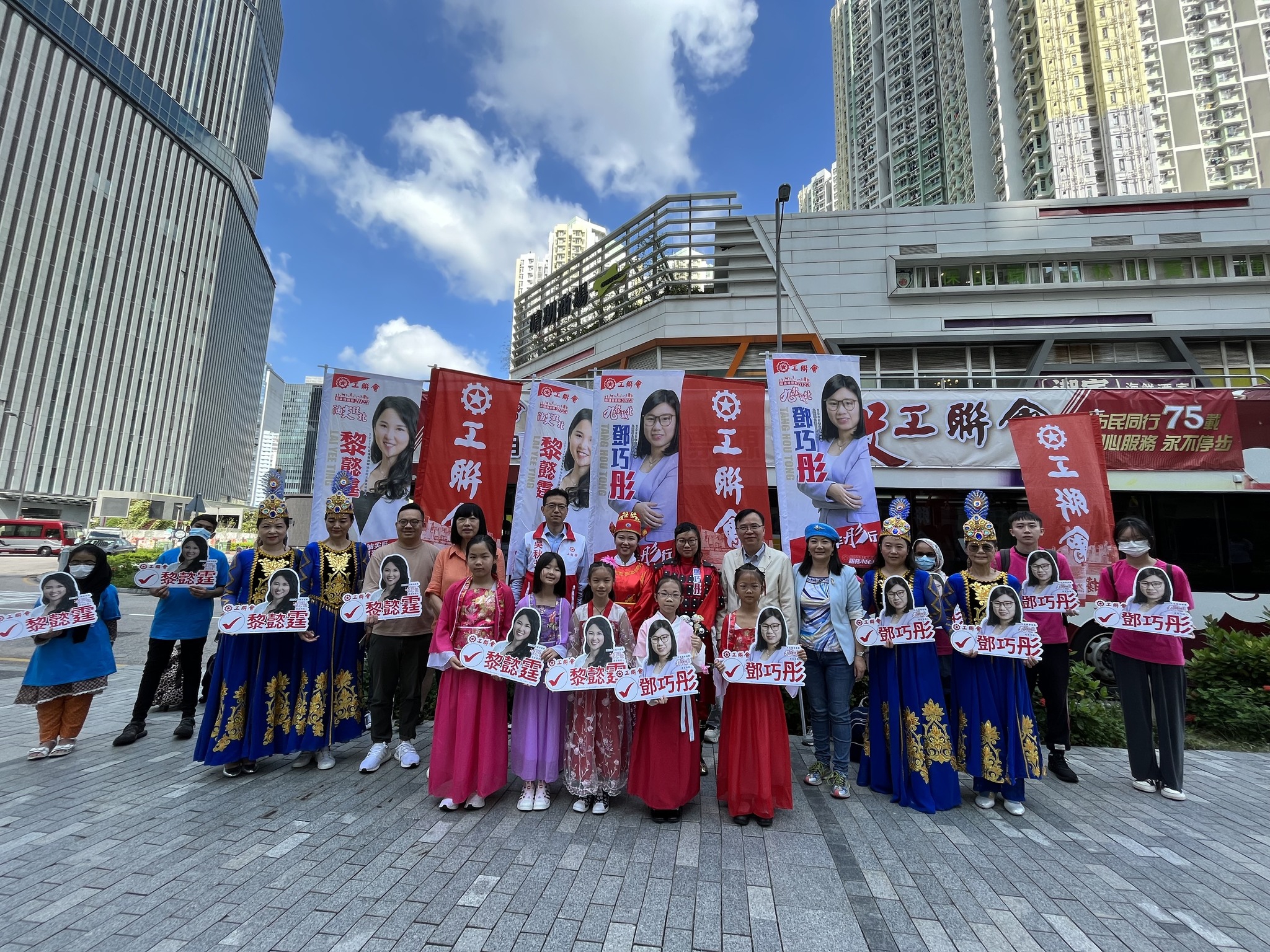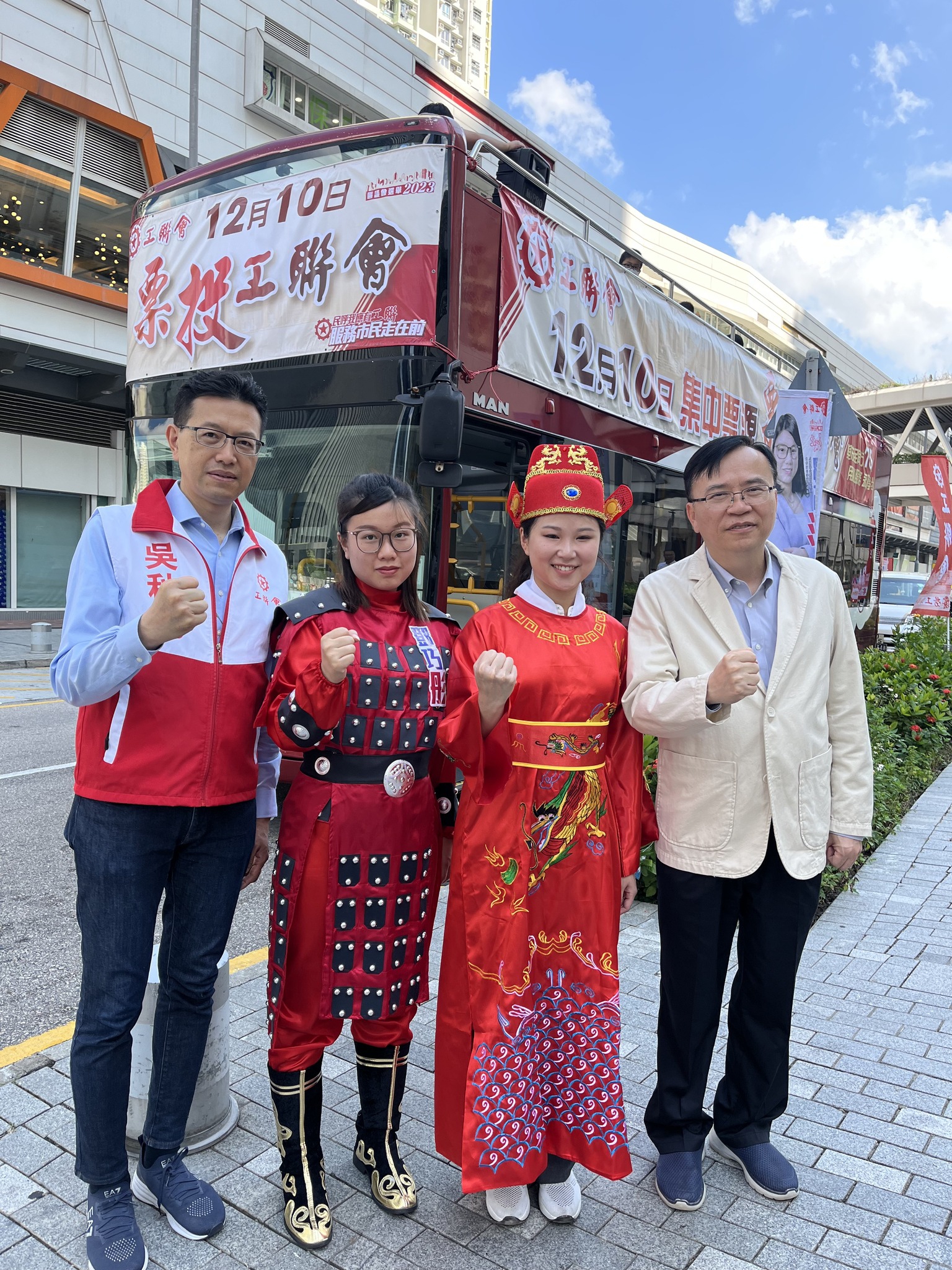工聯會今日(11月4日)舉行九龍區巴士巡遊,呼籲會員、市民在區議會的選舉日集中票源,票投工聯會。工聯會在九龍城北選區派出鄧巧彤及油尖旺北選區派出黎懿霆 2 位青年新力軍參選。工聯會會長吳秋北,理事長黃國,榮譽會長林淑儀,副會長謝愛紅出席巴士巡遊起步禮,呼籲選民,一票不能少票投工聯會。
