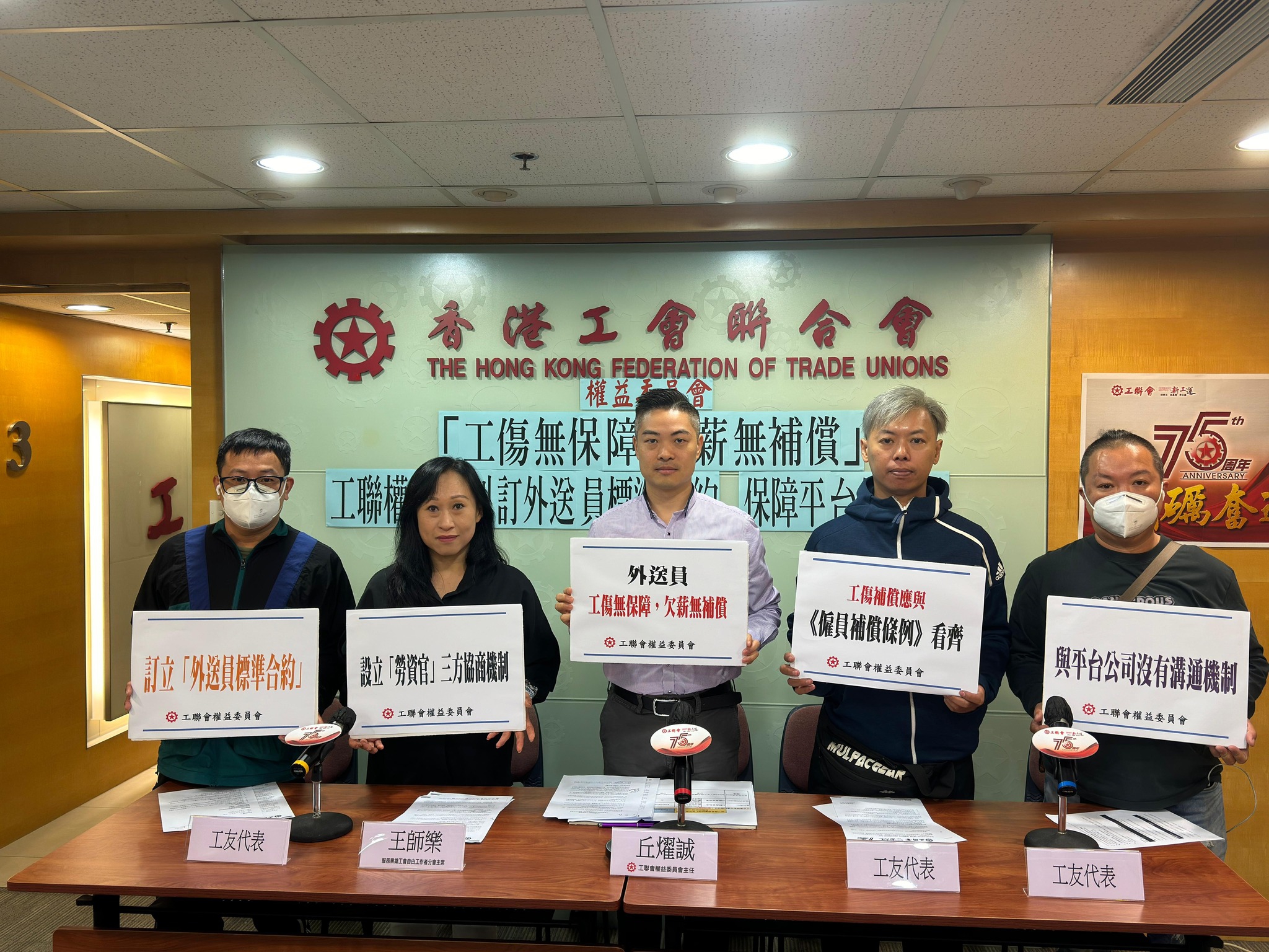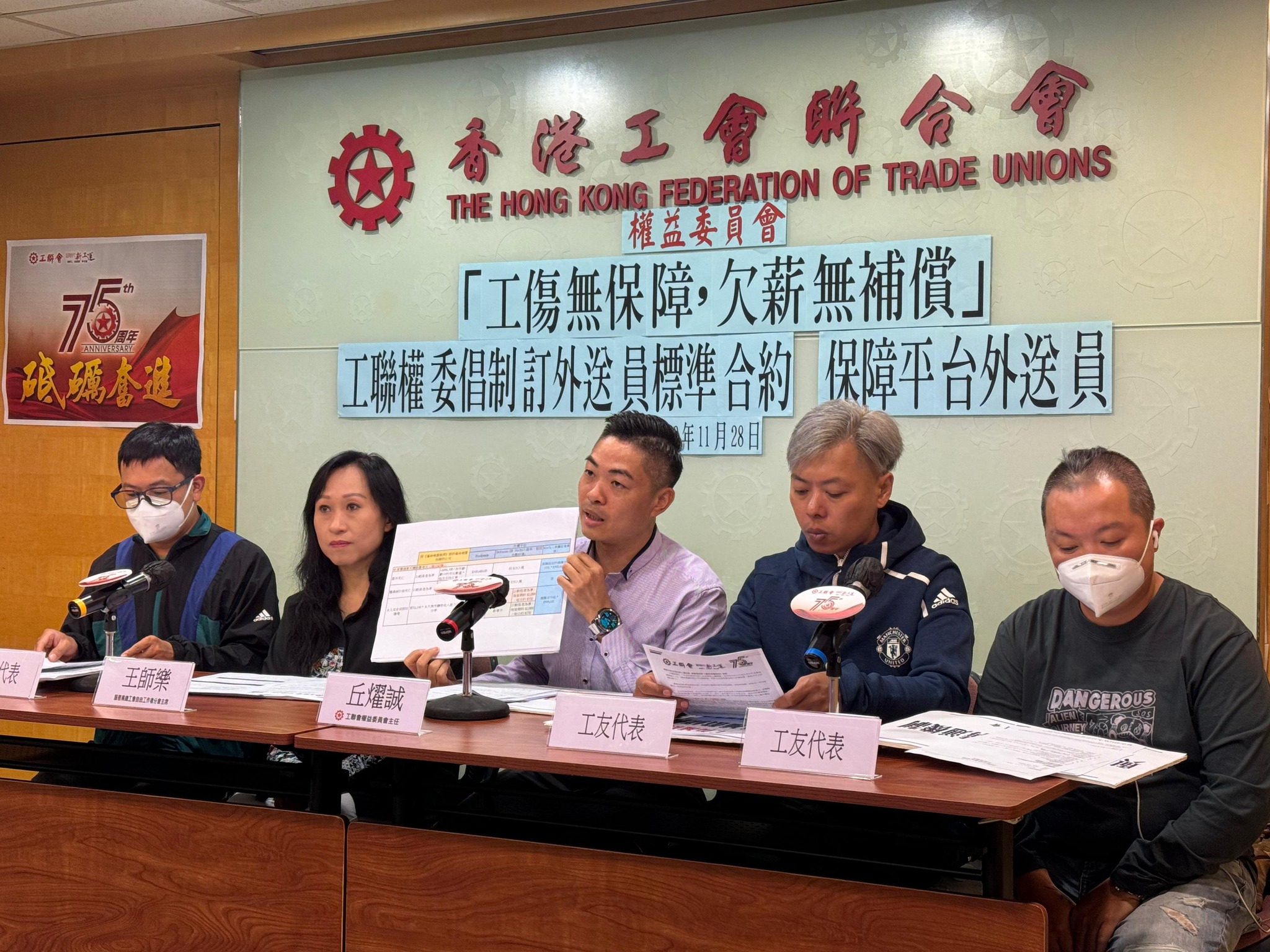 在新就業形態下,越來越多人從事平台外送員工作,惟平台公司視「步兵」及車手為自僱人士,不單欠缺基本勞工保障,甚至遇到意外也得不到工傷補償。故此,工聯會權益委員會(下稱:「工聯權委」)今日(11月28日)舉行記者會,促請政府填補漏洞,建議為外送員制訂標準合約,其合約內容須包括工傷保障、報酬相關細節等。同時,成立由政府主導的勞資官三方協商平台,就外送員權益保障的相關事宜進行溝通。