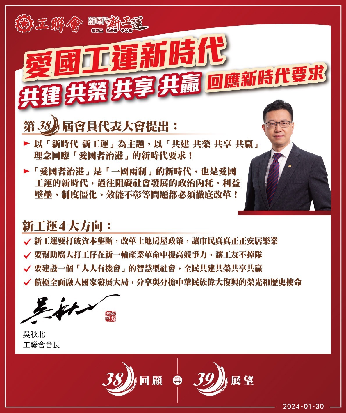 2024-01-30 【會員代表大會工作回顧與展望系列之一】會長吳秋北:愛國工運新時代 「共建共榮 共享共贏」回應新時代要求