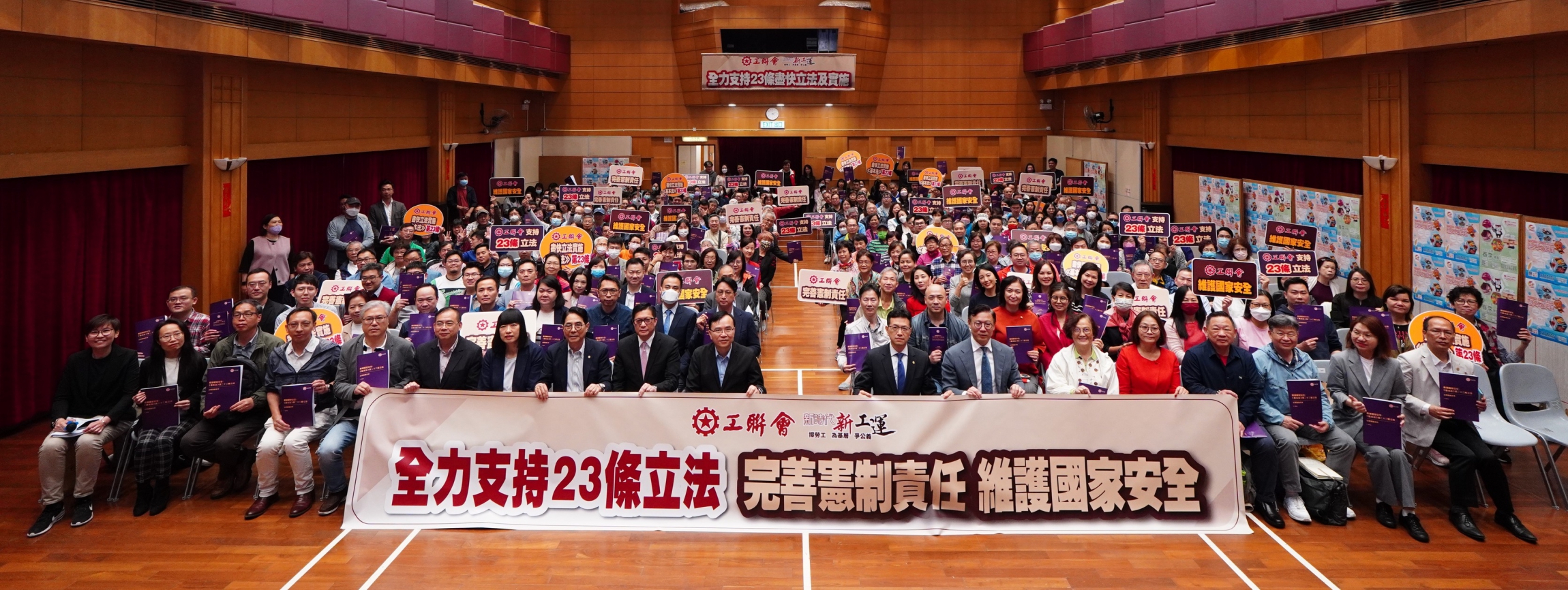 特區政府就《基本法》第23條立法進行公眾諮詢,工聯會今日(2月20日)再次舉辦諮詢會,邀請律政司副司長張國鈞,保安局局長鄧炳強到工人俱樂部向工會理幹事、議員丶地區社幹、工會會員和義工們講解23條立法工作,以及解讀條文細節,也聽取和即席解答出席者的建議和疑問。近400人出席,大家踴躍提問及發表意見,紛紛促請特區政府必須盡快立法,完成憲制責任,確保香港抵禦可能來襲的風險挑戰,維護好國家安全。