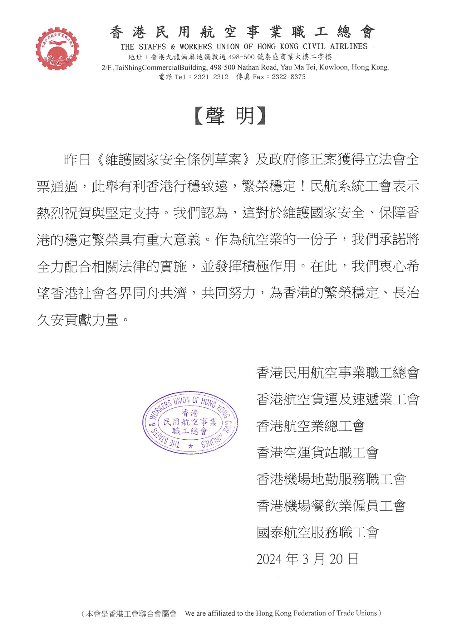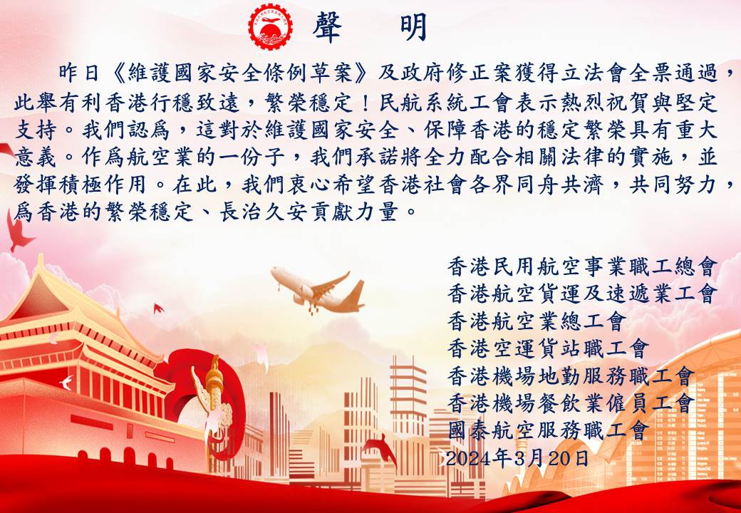 2024-03-20 香港民用航空事業職工總會等七工會:熱烈祝賀與堅定支持通過《維護國家安全條例草案》