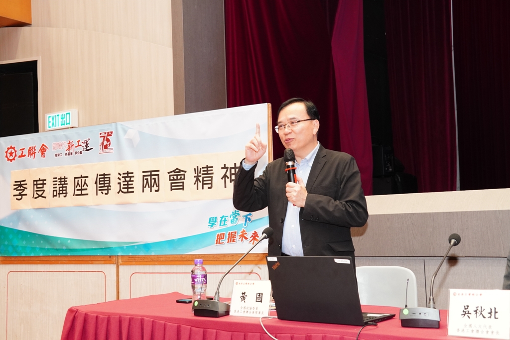 第十四屆全國人民代表大會第二次會議及中國人民政治協商會議第十四屆全國委員會第二次會議(兩會)在北京圓滿閉幕,工聯會今晚 (3月20日)舉行「兩會精神」傳達分享講座,由港區全國人大代表副團長、工聯會會長吳秋北,全國政協提案委員會副主任、工聯會理事長黃國及全國政協委員、工聯會秘書長馬光如主講,向工會理事、地區幹事、工聯會區議員、職員及義工傳達「兩會精神」,分享「兩會」的重點與意義,線上線下近千人參加。 吳秋北重點講解政府工作報告。報告指出,過去一年是全面貫徹落實中國共產黨「二十大」精神的開局之年,面對異常複雜的國際環境和艱鉅繁重的改革發展,以總書記習近平為核心的黨中央團結帶領全國各族人民,頂住外部壓力、克服內部困難,付出艱辛努力,新冠疫情防控實現平穩轉段、取得重大決定性勝利,而全年經濟社會發展的主要目標任務均圓滿完成,高品質發展紮實推進,社會大局保持穩定,全面建立社會主義現代化國家邁出堅實步伐。今年是中華人民共和國成立75周年,是實現「十四五」規劃目標任務的關鍵一年,我國發展面臨的環境仍是戰略機遇和風險挑戰並存,有利條件强於不利因素,因此,堅持穩中求進,以進促穩,先立後破。 吳秋北亦就國務院組織法的修訂進行解讀,這是施行了40多年的國務院組織法首次進行修改,共修訂20條,重點包括:堅持正確的政治方向,明確黨和國家的指導思想、强化人民組成,堅持以人民為中心的發展思想,建設人民滿意的政府、依憲立法,建立法治政府的重要面向以及用科學的工作方法,深化黨和國家機構改革、推動國家治理體系和治理能力現代化。吳秋北希望透過傳達「兩會精神」,發揮人大代表橋樑和紐帶的作用,將黨中央的指示落實到具體工作中,工聯會願意與愛國愛港隊伍合作,發揮帶頭作用,推動社會團結奮進,共同為香港經濟民生建設,為國家現代化強國建設、實現第二個百年奮鬥目標作出應有的貢獻! 黃國分享了中央政府工作報告內容。他指出,工作報告對香港,對工會都有重要的啟示作用。國家已邁入高質量發展新篇章,生產模式正向發達國家看齊,未來發展是超前的。因此,為融入國家發展大局,香港應重視職業教育發展,培養高技能人才,填補高技能人才缺口。打出「大國工匠」名牌,培育知識、精神、技能並重的人才,推動傳統產業高端化、智能化、綠色化發展轉型。此外,他指出,「兩高」報告關注新就業形態和數字經濟中勞動者的權益,明確把「付出實質性勞動」和「明顯佔用時間」作為線上「隱形加班」的認定標準,希望香港可以借鑒,進一步保障勞動者權益,提升職工生活品質。黃國希望香港也能實現讓工人階級分享經濟勞動成果,市民的收入增長與經濟增長同步,實現共同富裕。 黃國又表示,兩會期間,中共中央政治局常委、國務院副總理丁薛祥參加了港澳地區全國政協委員聯組會議,並發表重要講話,表現了中央對港工作決心和信心。國家正取得歷史性的成就,經濟增長走在世界前列,發展的後勁充足。未來,中央會繼續支持香港發揮自身優勢,打造香港「八大中心」的定位,發展經濟,改善民生,共創美好明天。![]()