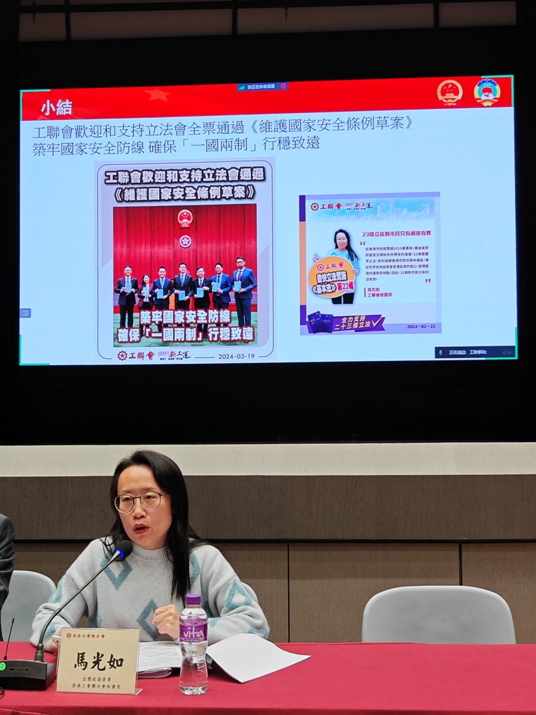 馬光如表示,工聯會歡迎和支持立法會全票通過《維護國家安全條例草案》。維護國家安全是社會安定的基礎,是保持良好營商環境、市民樂業安居的關鍵因素;完成國安立法是築牢國家安全防線,確保「一國兩制」行穩致遠。