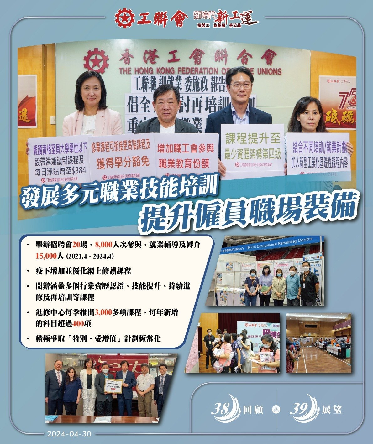 新時代 新工運 | 撐勞工 為基層 爭公義 會員代表大會 工作回顧及展望系列十五 第38屆回顧 | 展望 發展多元職業技能培訓 提升僱員職場裝備 ■工聯會進修中心等服務機構積極發展及提升多元職業技能培訓,以及為協助工友就業、轉業,共舉辦招聘會20場,8,000人次參與,就業輔導及轉介15,000人。