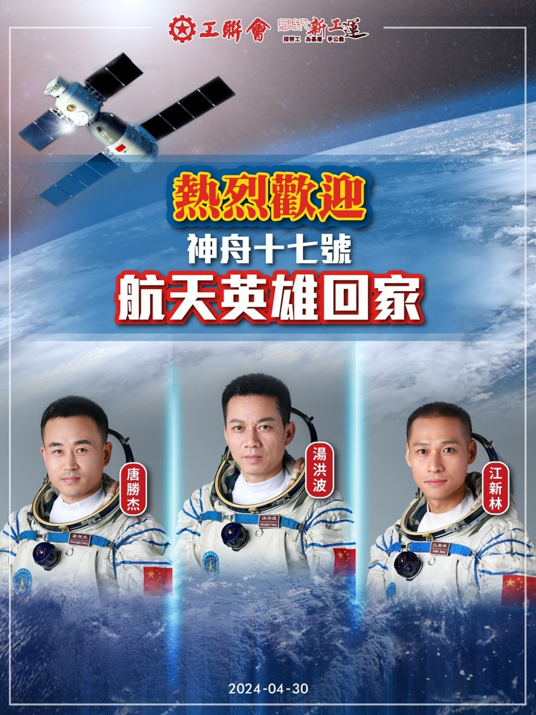 神舟十七號載人飛船返回艙今日下午順利在東風著陸場成功著陸。現場醫監醫護人員確認三名航天員湯洪波、唐勝杰、江新林身體狀態良好。工聯會熱烈歡迎航天英雄回家!