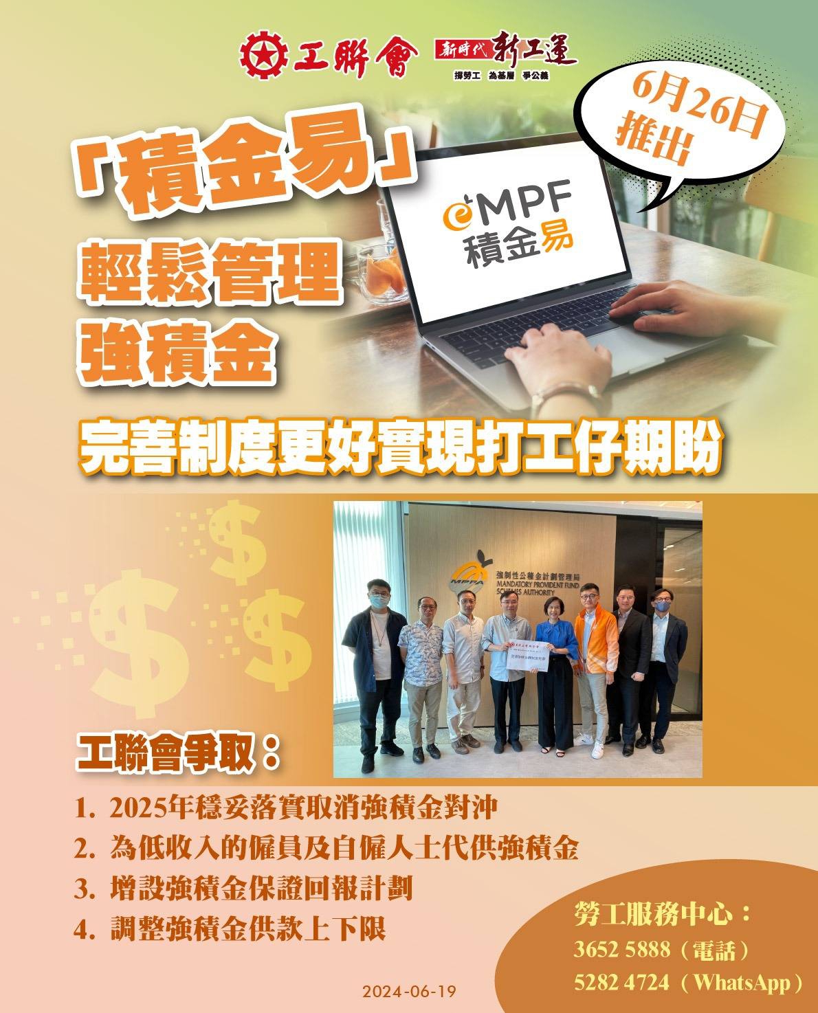 「積金易」的啟用只是一個開始,打工仔通過平台能輕鬆管理強積金,降低行政費,獲實際的得益。工聯會希望政府盡快落實優化強積金制度措施,更好實現打工仔的期盼。 工聯會促持續優化強積金制度﹕ 1. 2025年穩妥落實取消強積金對沖 2. 政府為低收入的僱員及自僱人士代供強積金 3. 增設強積金保證回報計劃 4. 調整強積金供款上下限