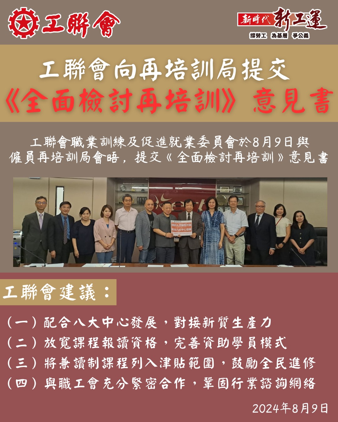 工聯會副會長及職業訓練及促進就業委員會主任陳鄧源、副會長及工人俱樂部主任程岸麗、職業訓練及促進就業委員會副主任楊榮輝、李永富、譚慧華,以及工聯會職業再訓練中心總幹事鄧詠芳要求全面檢討目前的再培訓制度,放寬課程報讀資格。建立導師人才庫及將兼讀制課程納入津貼範圍等,