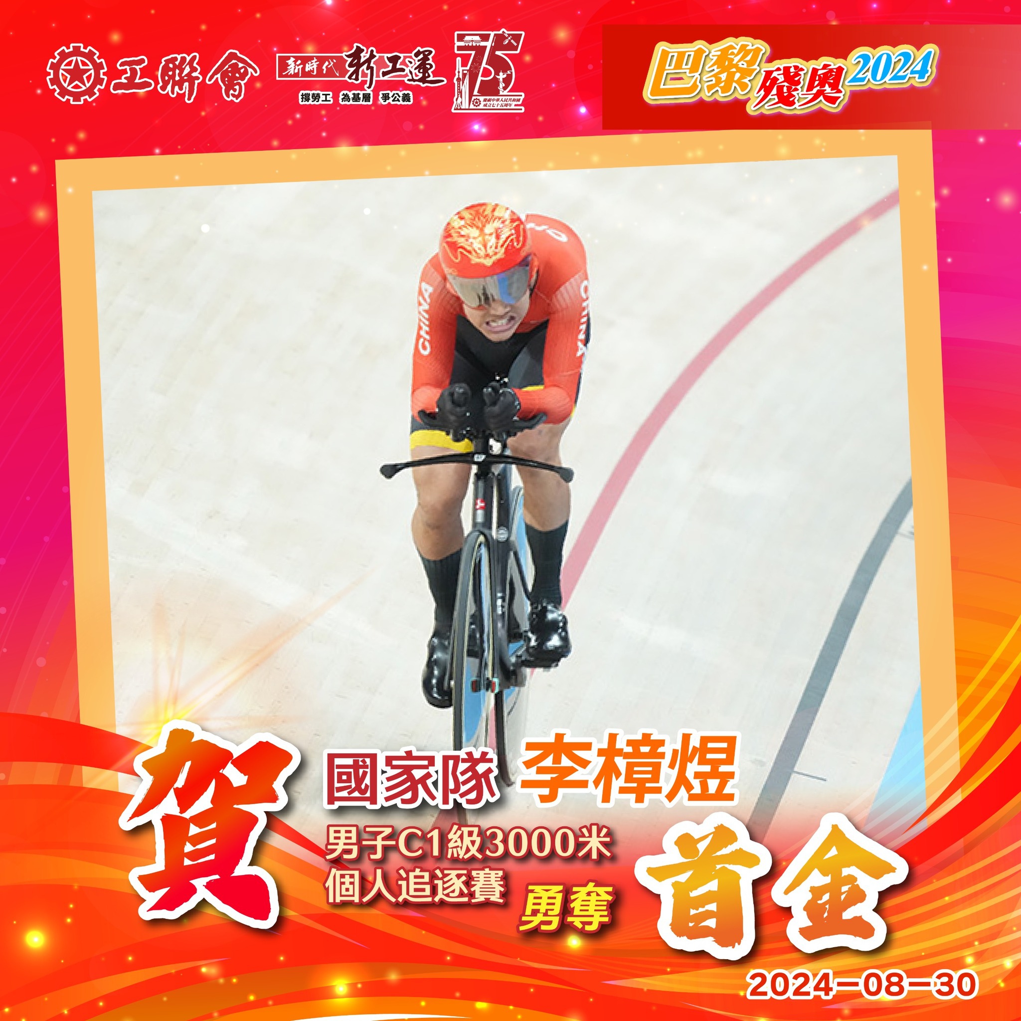 香港時間8月29日深夜,「四朝元老」李樟煜在巴黎殘奧男子C1級3000米個人追逐賽決賽中,力壓隊友梁偉聰奪首金,為國家隊包攬場地單車賽事的冠、亞軍,亦是國家隊於今屆的首兩面獎牌。