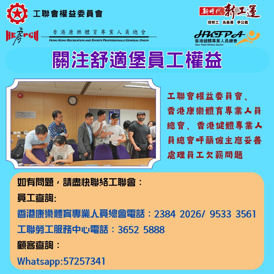 員工查詢: 康體專工會電話:2384 2026/ 9533 3561 工聯勞工服務中心電話:3652 5888