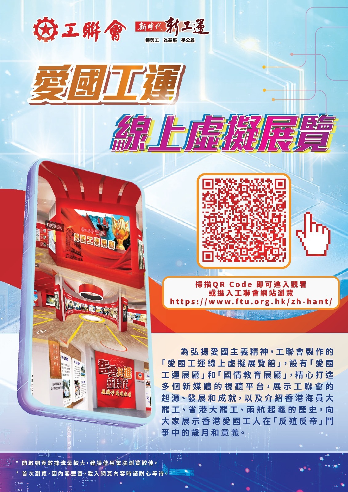 「愛國工運線上虛擬展覽館」,設有兩大展區,分別是愛國工運展廳以及國情教育展廳,展出大量工聯會歷史圖片、工會文物等資料,展示工聯會的起源、發展和成就。還精心打造多個視聽平台,有工會前輩的口述歷史紀錄;著名音樂人作曲和作詞的工聯會會歌《同步同心》;展板亦附有二維碼,點擊即可聽到口述歷史,其中會長吳秋北和理事長黃國錄製了部分章節。