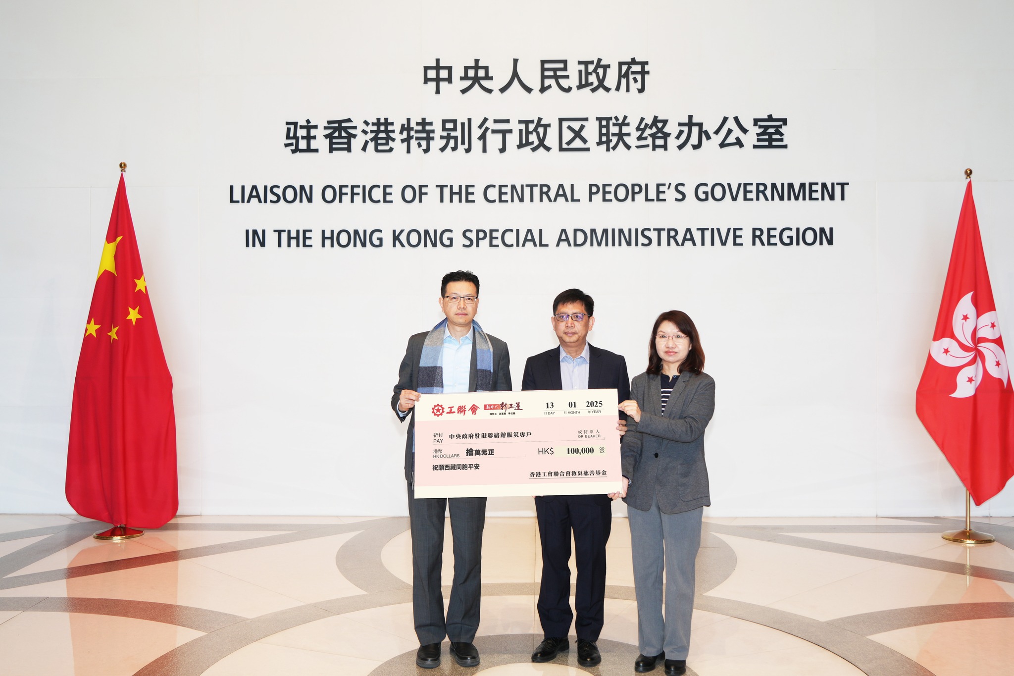 西藏自治區定日縣發生6.8級地震,最少造成百多人遇難,超過3600戶房屋倒塌,約6.15萬人有不同程度受災。工聯會心繫受災同胞,本著「一方有難 八方支援」的精神,立即從香港工會聯合會救災慈善基金撥出10萬元善款援助災區,並第一時間發起全港籌款行動。工聯會會長吳秋北,副會長曾志文今日(13日)將善款支票遞交給中央政府駐港聯絡辦(中聯辦)轉交西藏政府部門作為賑災之用,由中聯辦社工部副部長吳小玔代表接收。