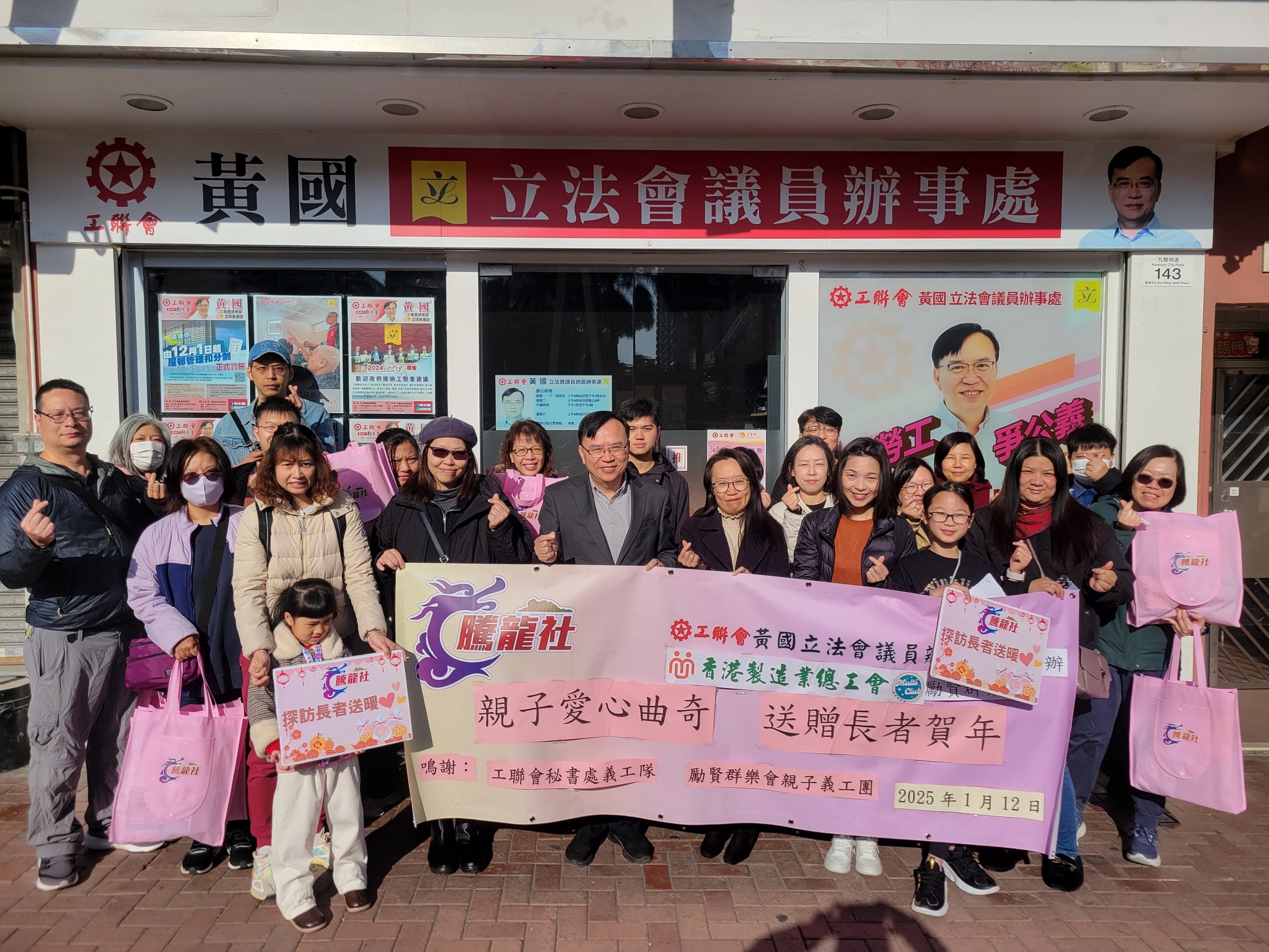 工聯會理事長、立法會議員黃國於1月12日與副會長兼秘書長馬光如、副秘書長兼沙田區議員陳善明,聯同工聯會秘書處義工隊和勵賢群樂會親子義工團,上門探訪土瓜灣區內年邁長者,送贈早前於暖心麵包 工場製作的手工曲奇、合桃酥及過年物資,在新春來臨前獻上關懷,表達社區暖意。