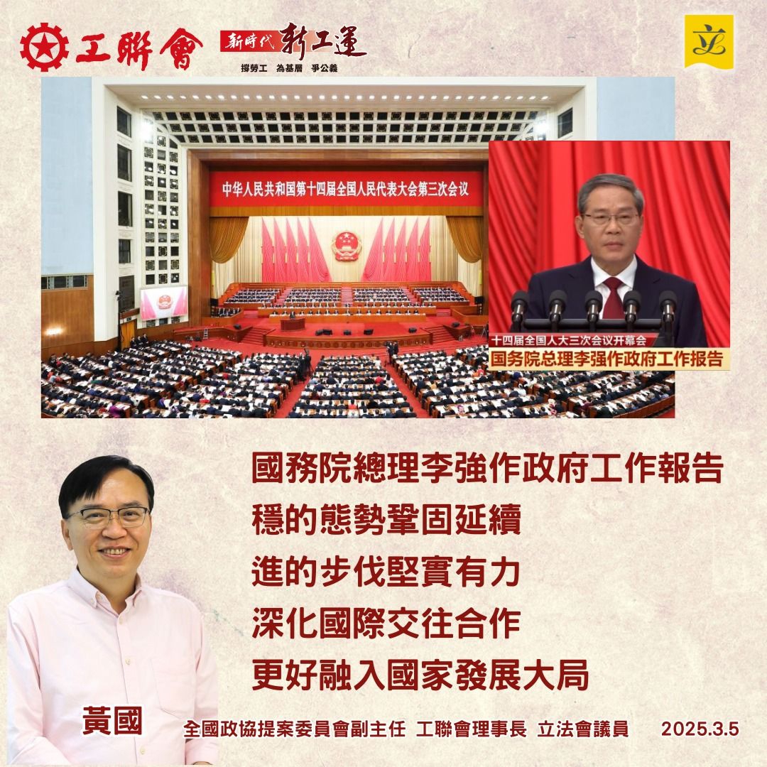 全國政協提案委員會副主任、工聯會理事長黃國表示,作為全國政協委員一份子,將繼續凝聚社會各界力量,充分發揮香港獨特優勢,緊扣國家戰略需求,以務實行動推動香港融入國家發展大局。聚焦推動大灣區規則銜接和機制對接,助力醫療、安老、職業教育等民生關鍵領域深化協同發展,透過政策聯動、資源整合和試點突破,探索可行的民生問題解決方案,切實提升市民幸福感和獲得感!