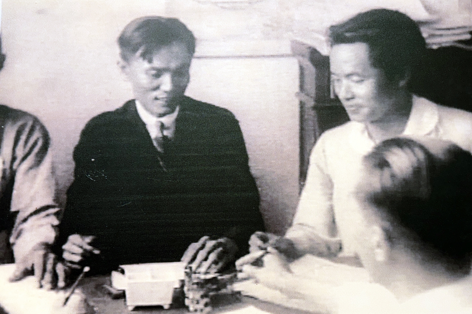 ▲ 蘇兆徵(左)與鄧中夏(右)等人與香港工會領袖開會。 |
