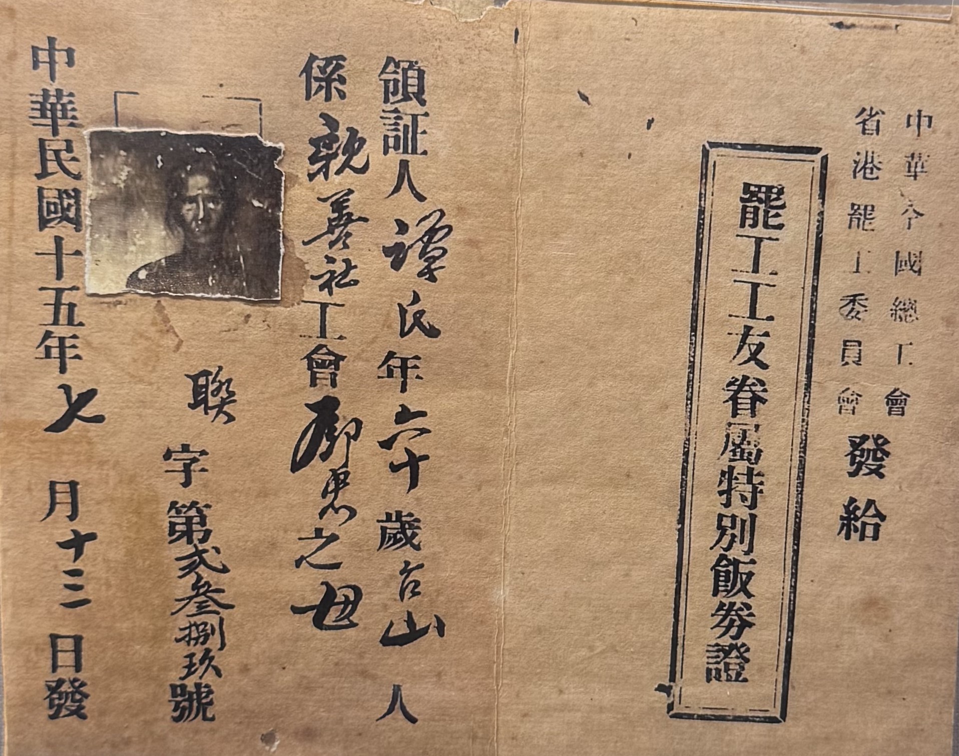 ▲ 為解決罷工工友家屬生活困難,省港罷工委員會印發工友眷屬特別飯券證。工友家屬凭此證可在罷工工人食堂免費用餐。 |