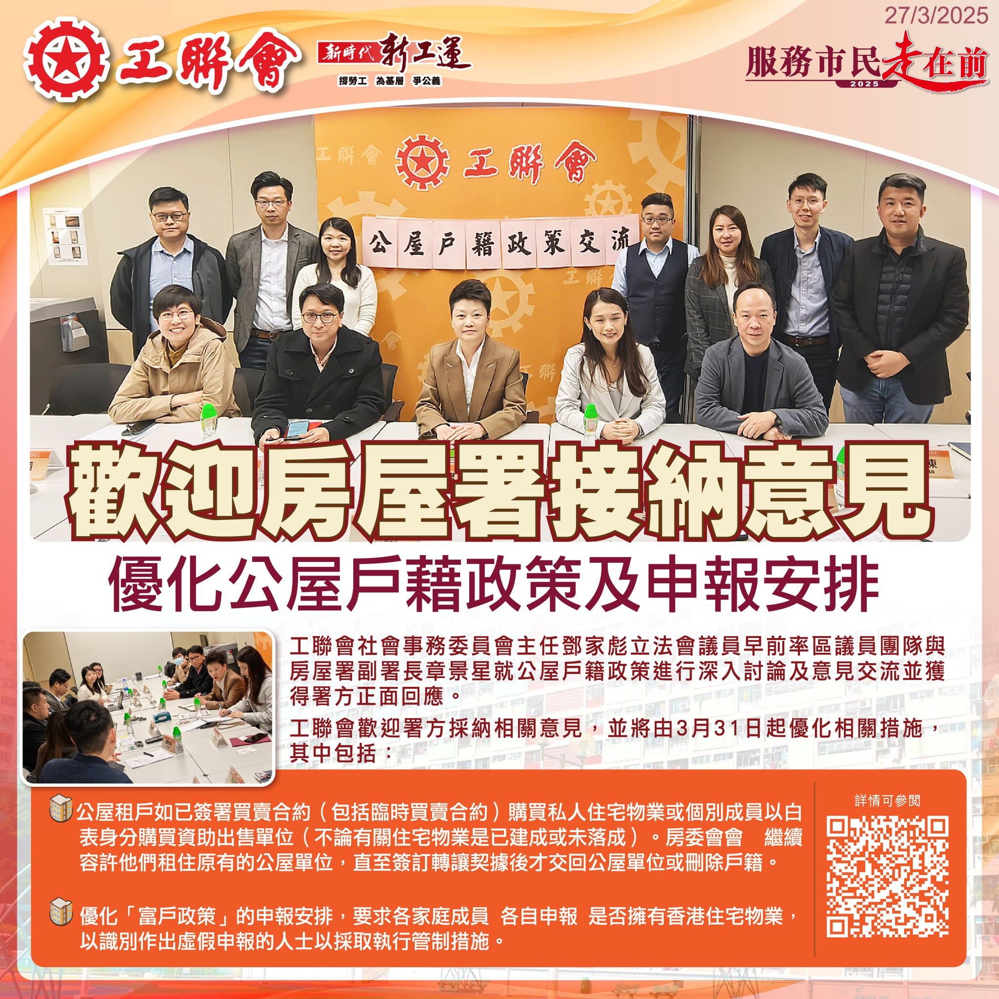 2025-03-27 工聯會歡迎房屋署接納意見 優化公屋戶藉政策及申報安排