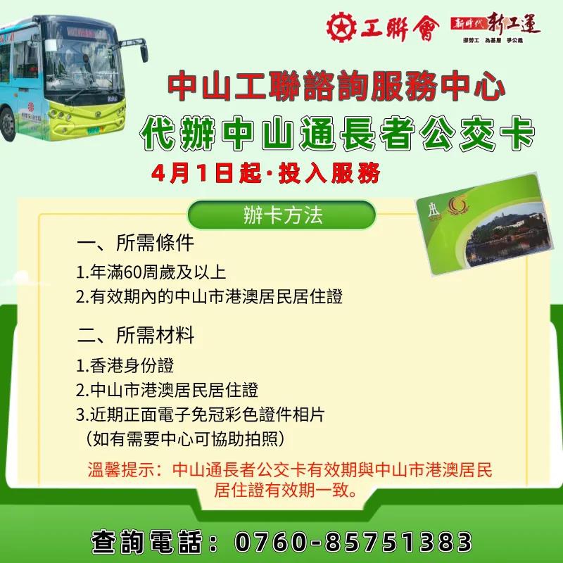 為讓香港居民在中山市使用公共交通更加便利和快捷,中山工聯諮詢服務中心(中山中心)今天(4月1日)起,與中山市中山通智能卡有限公司進行合作,協助年滿60周歲以上且持有效期內的中山市港澳居民居住證的香港長者辦理中山通長者公交卡,以享受中山市公交免費乘車優惠。