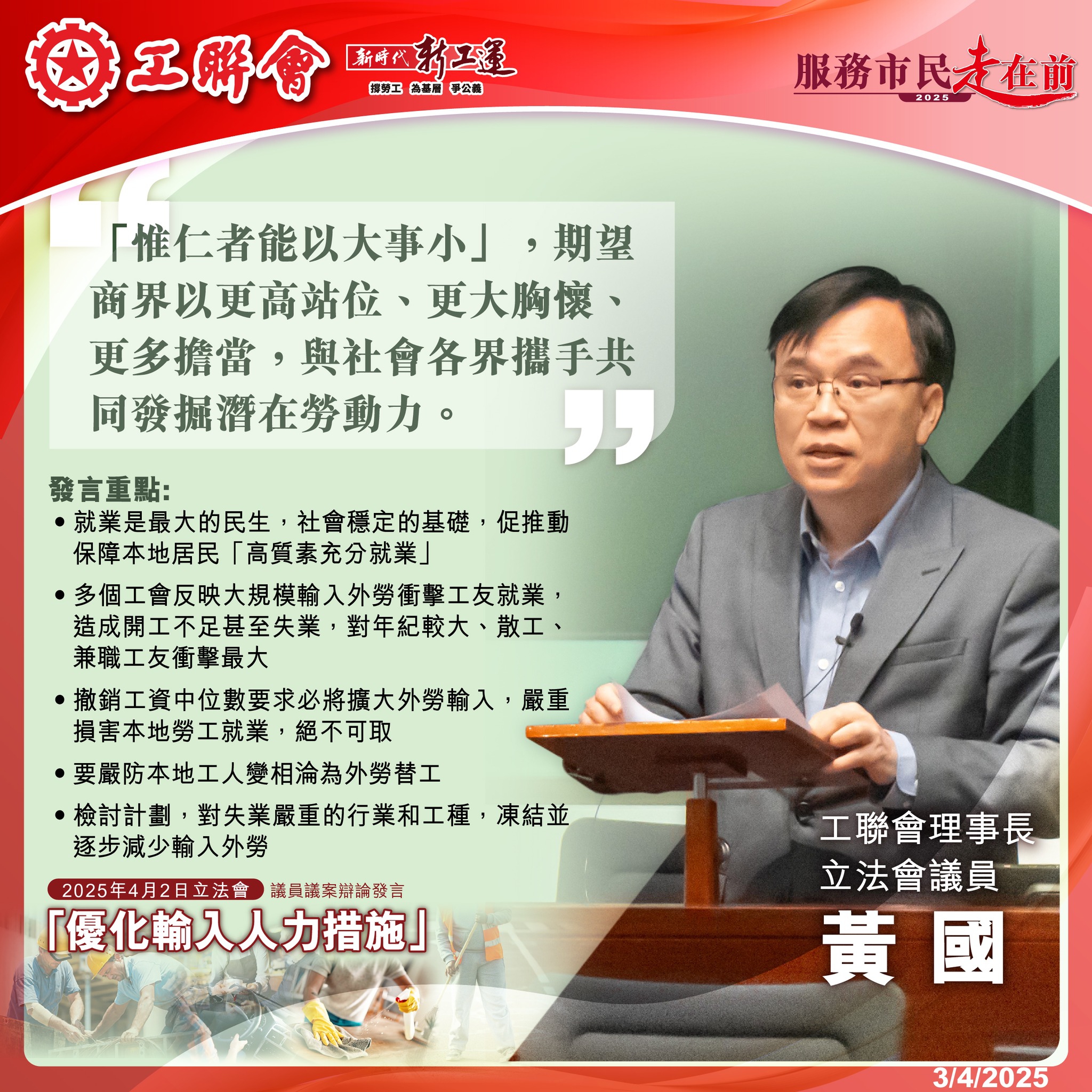 工聯會理事長、立法會議員黃國在立法會會議上指出,「惟仁者能以大事小」,期望商界以更高站位、更大胸懷、更多擔當,與社會各界攜手共同發掘潛在勞動力。