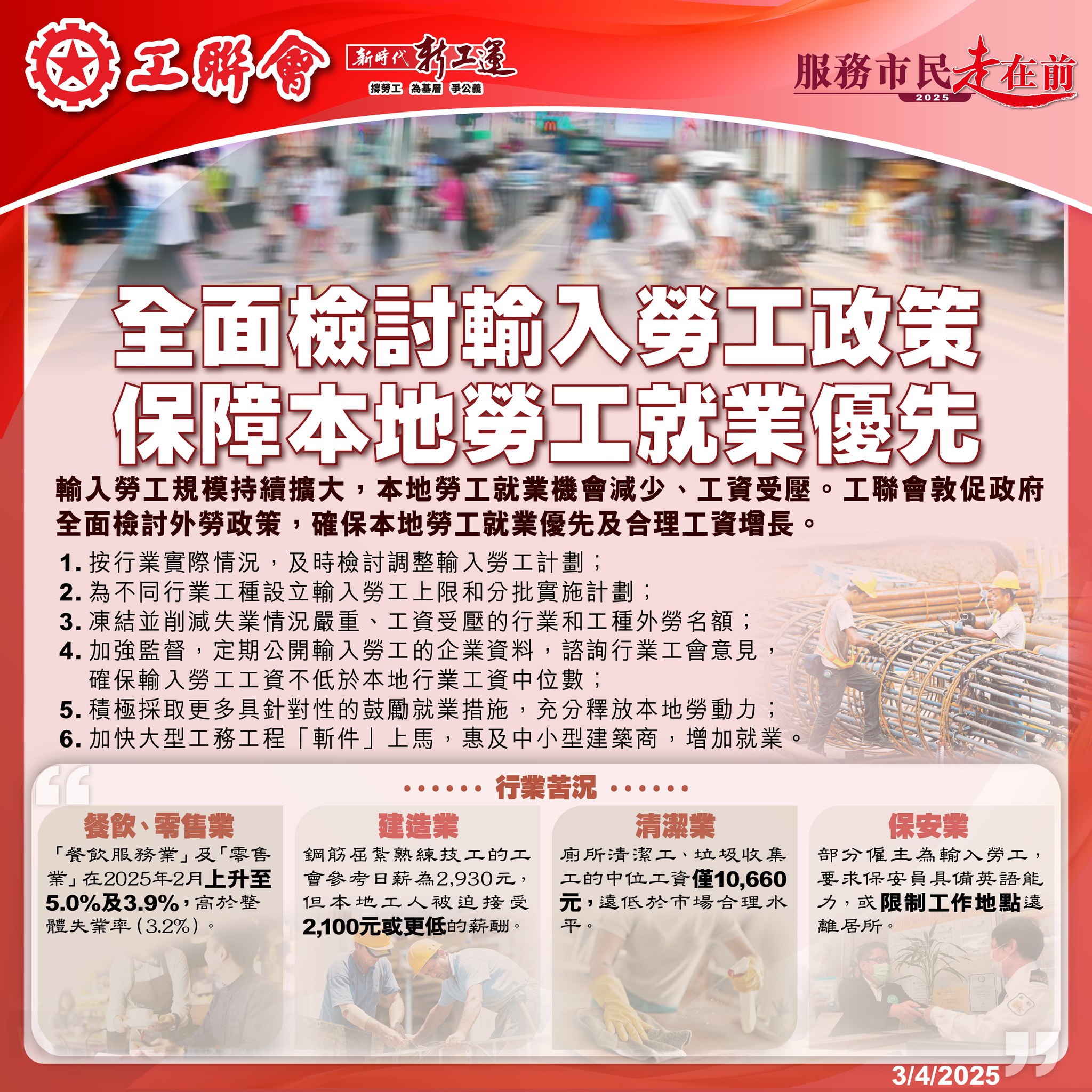 2025-04-03 工聯會議員團隊堅決表明反對進一步放寬和擴大輸入外勞 向政府爭取盡快檢討並收緊相關輸入政策