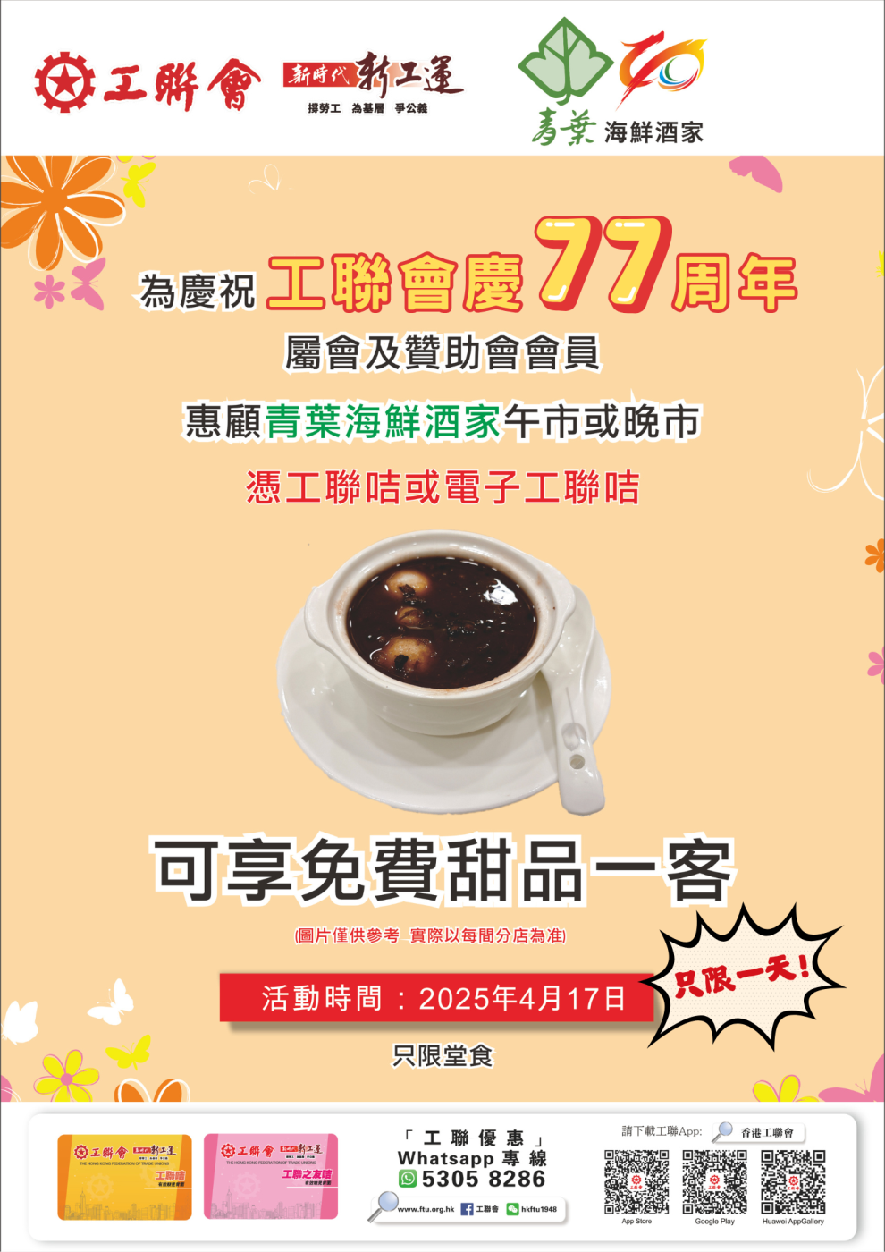 優惠: 2025年4月17日 (只限當天) 會員於會慶當日只需出示工聯咭或電子工聯咭,即可享全單9折及免費甜品一客** **午市、晚市皆適用;只限堂食;甜品種類視乎各店供應,送完即止! 分店: