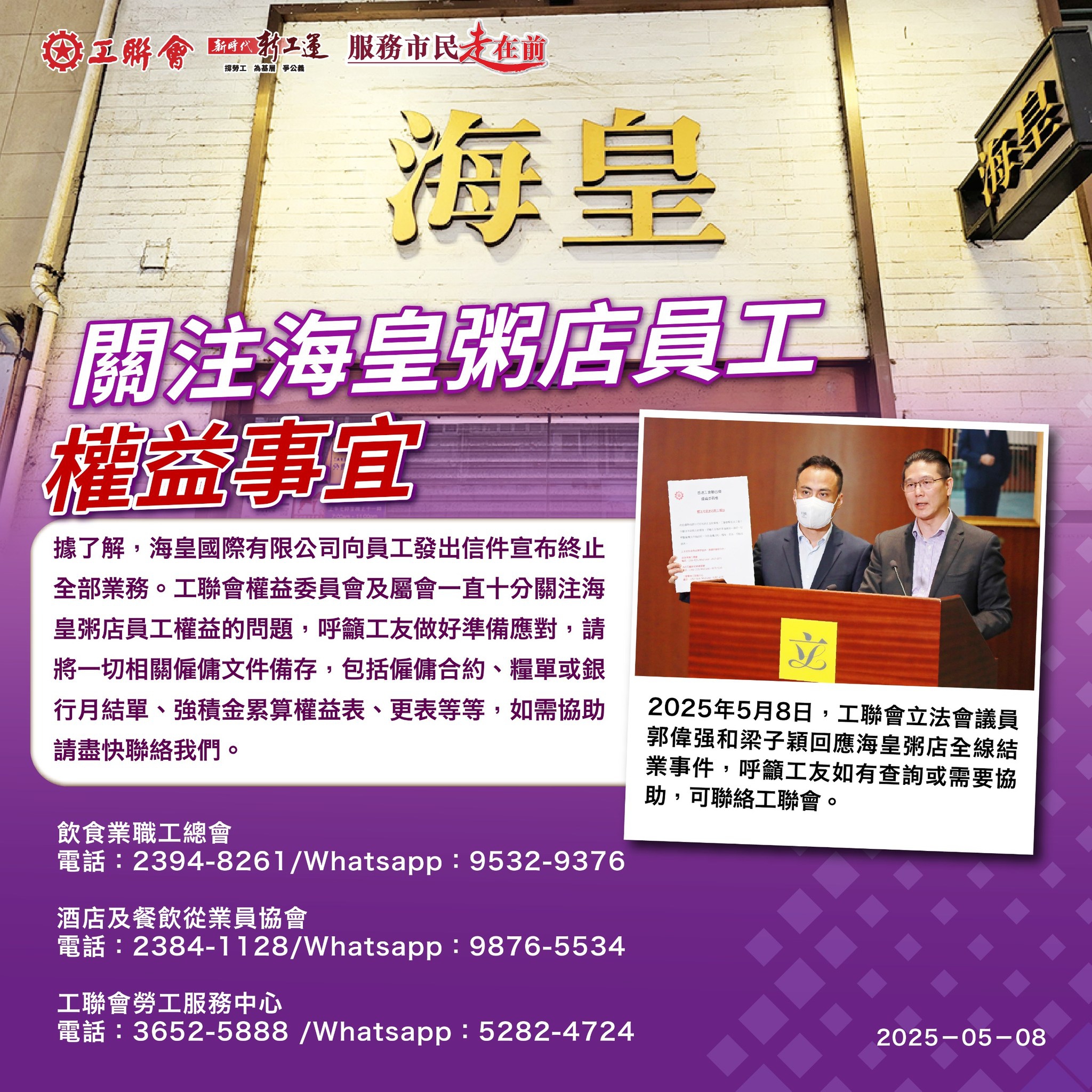 2025-05-08 工聯會及屬會高度關注海皇粥店員工權益事宜
