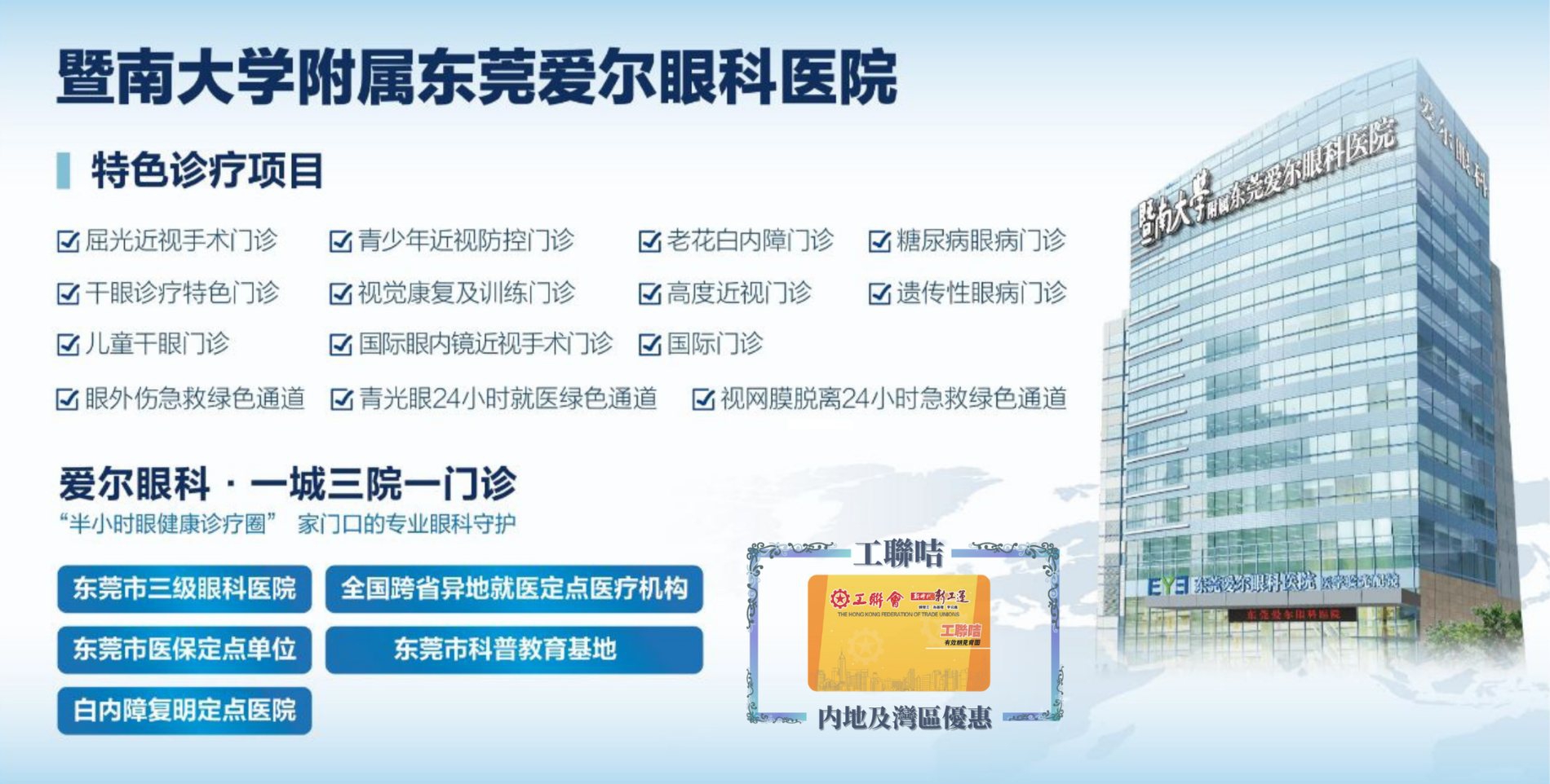 優惠使用細則: 1. 會員必須提前預約; 2. 會員於到診時須支付掛號費用; 3. 如按照以上檢查項目檢查無需額外收費;若進行其他檢查或者治療,將按醫院費用收費; 4. 會員一年內只可使用每項免費檢查項目一次; 5. 會員必須持有以下所述任何一款身份認證:工聯咭實體咭、工聯App內的電子工聯咭、工人俱樂部部員實體證或工聯App內工人俱樂部電子部員證; 方可進行確認並按預約使用優惠; 6. 請注意: 如因證件/會籍過期、遺失、忘記攜帶或挪用其他會員身分進行預約,一律無法享受免費眼健康檢查項目; 7. 東莞愛爾眼科醫院、東莞虎門愛爾眼科醫院均可接受以人民幣現金、Visa/ Mastercard結算;香港微信支付、香港支付寶如已綁定銀聯儲蓄卡或信用卡、銀聯信用卡或儲蓄卡都可直接刷卡使用。會員應提早準備多於一種的支付方式,以免失去預算; 8. 如有任何爭議,東莞愛爾眼科醫院及東莞虎門愛爾眼科醫院保留最終之決定權。![]()