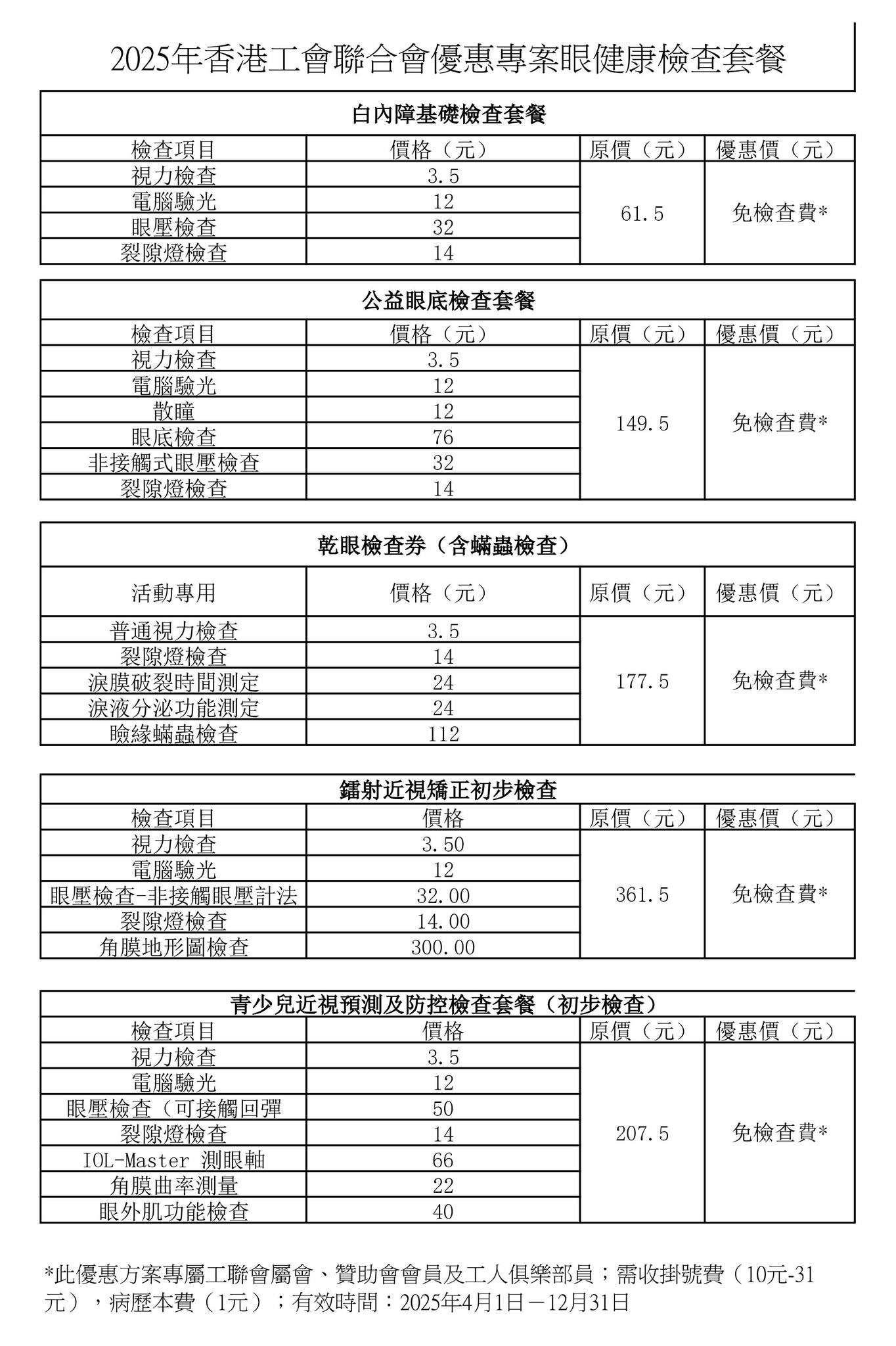 優惠內容: 工聯咭優惠: 會員預約5項指定眼健康檢查項目,可豁免檢查費* (*到診時需支付掛號費約RMB 10 至RMB 31元,病歷本費RMB 1元)