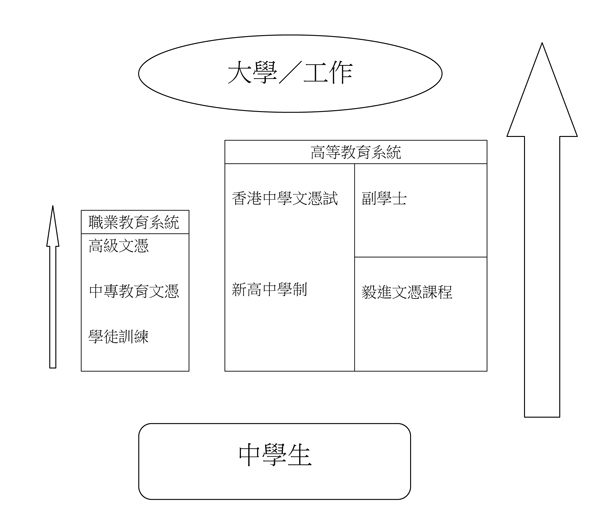追本溯源,這實在要歸因於政府帶頭削減及輕視職業教育。九十年代中期前香港中學主要分為文法中學、工業學校和職業先修學校,專上教育與職業教育兼容並存。但自從知識型經濟成為香港經濟發展的硬道理後,專上教育從此膨漲獨大,職業教育則不斷萎縮。人力資源政策「重文輕武」,學生與家長自然對職業教育棄之如敝屣。表面上年青人因著大學學位增加,副學士、毅進文憑及展翅青見等新計劃相繼出現而增加了升學就業的能力,但實際上年青人的競爭力卻屢受質疑、「債仔」學生暴增、技術人才新血不足,經驗技術的累積與承傳自然閉塞,直接影響經濟發展(見附圖)。