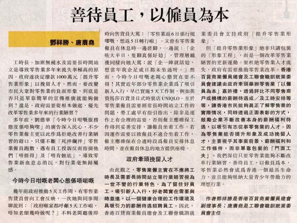 由此觀之,零售業僱主實在不應將工時長及需要長時間站立等行業陋習視為一世不變的行業特色。為了留住好員工,吸引新人入行,好老闆實在需要與時並進,以一個健康合理的工作環境及具吸引力的薪酬待遇招聘員工。因此,香港百貨商業僱員總會及工聯會職訓就業委員會支持政府「提升零售業形象」。