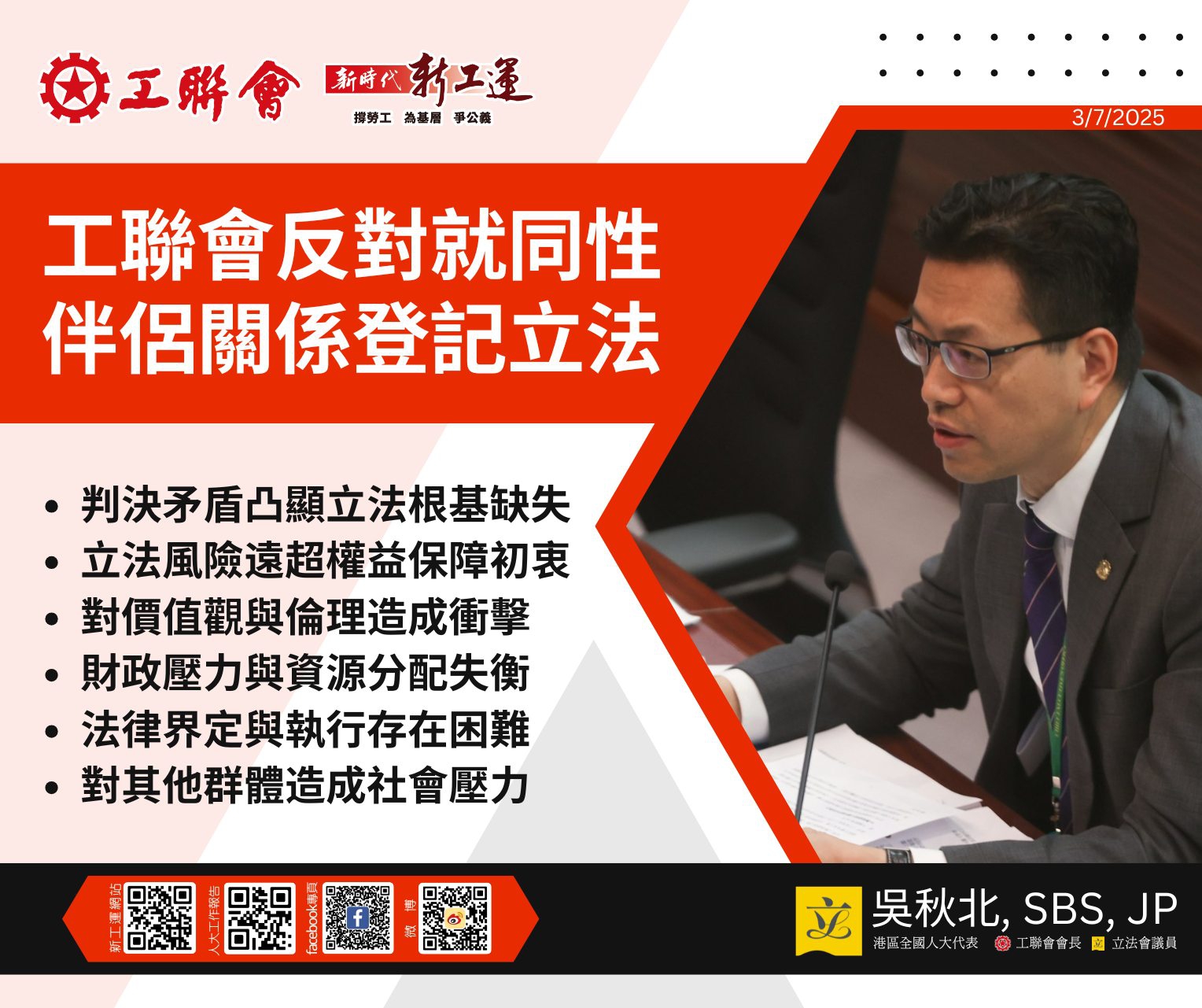 最後,再次鄭重重申,工聯會堅決反對這項法案。我們尊重人人平等,尊重個人選擇,對於同性群體的訴求,我們表示理解,認同在社會共識的前提下,尋求其他解決辦法,希望政府跳脫「不立法無替代」的思維陷阱。![]()