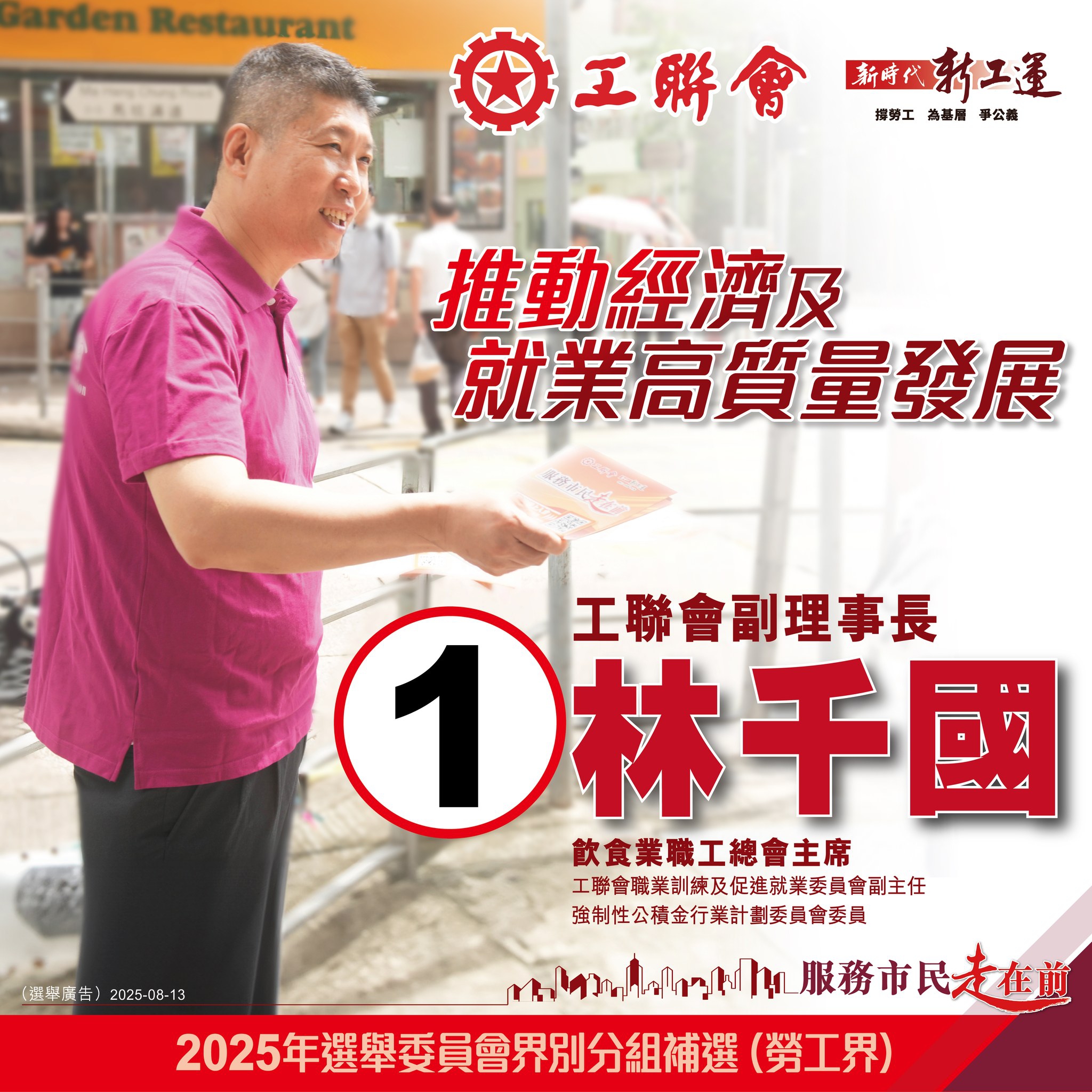 林千國獲飲食業職工總會推薦、工聯會支持,參加2025年選舉委員會界別分組補選(勞工界),為行業發展出一分力,推動經濟及就業高質量發展。