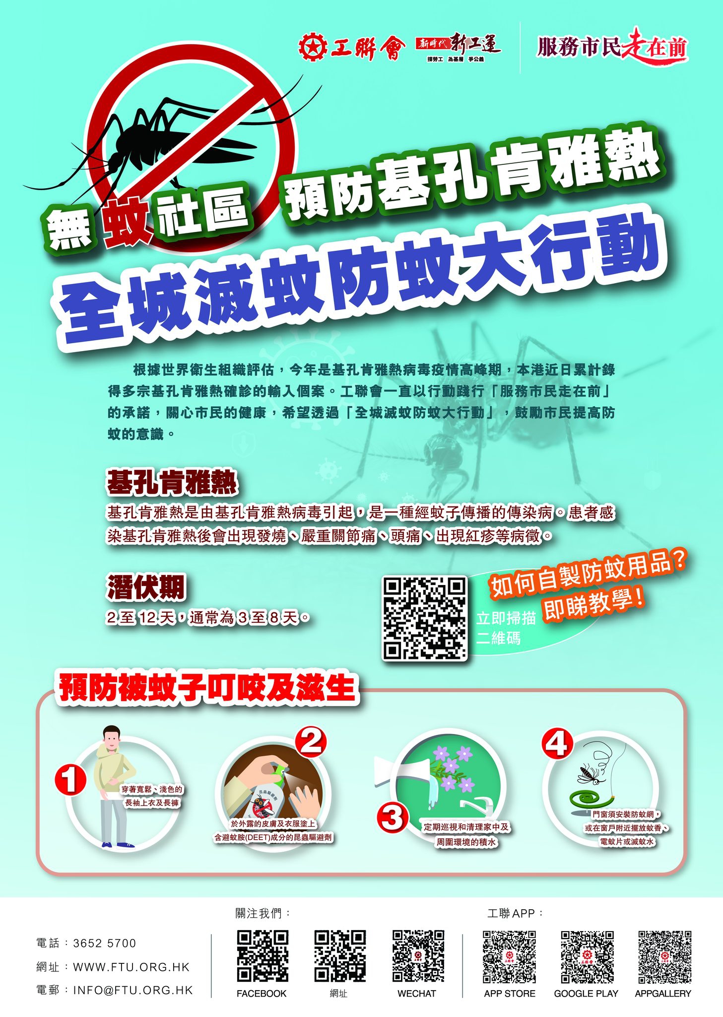 工聯會一直以行動踐行「服務市民走在前」的承諾,關心市民的健康。就最近香港累計錄得多宗基孔肯雅熱確診的輸入個案,工聯會繼早前舉行全港街站活動,開設超過350個街站,免費派發防蚊貼給市民後,今日(20日)起與地區服務處再在全港設街站,免費派發防蚊貼給市民。更邀請導師教大家自製防蚊用品。想了解如何在家都能自製防蚊用品?請即掃一掃海報上的QR Code睇教學!