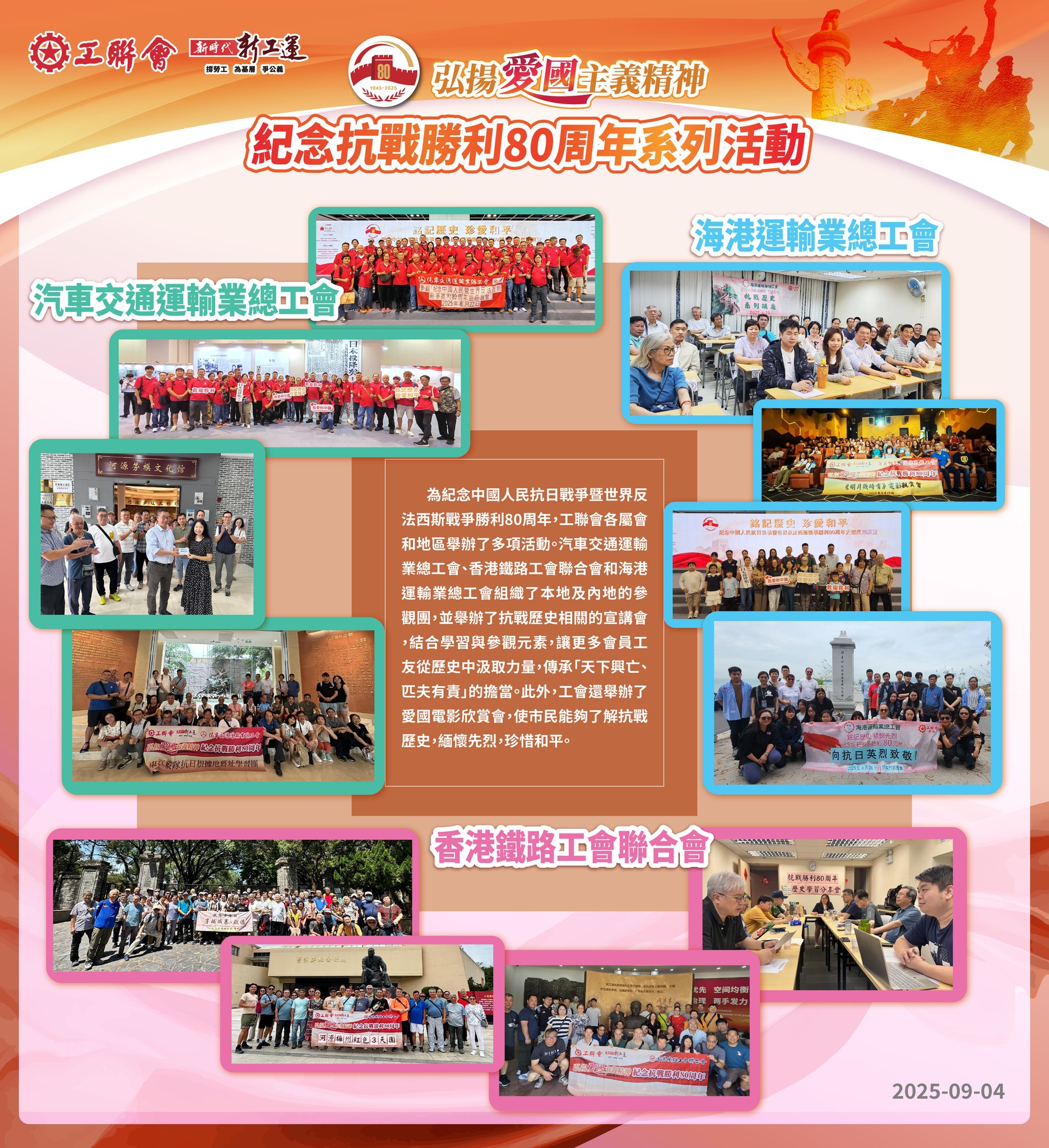 今年是中國人民抗日戰爭暨世界反法西斯戰爭勝利80周年,工聯會各屬會和地區舉辦了多項活動,讓市民了解抗戰歷史,承傳及宣揚愛國主義教育。其中汽車交通運輸業總工會、香港鐵路工會聯合會和海港運輸業總工會為汽車、鐵路、海港運輸行業的工友舉辦了愛國電影欣賞會、宣講會和參觀團,讓市民銘記香港工會在抗戰中的歷史功績,傳承和弘揚偉大的抗戰精神,激勵社會各界銘記歷史、珍愛和平、共創未來。