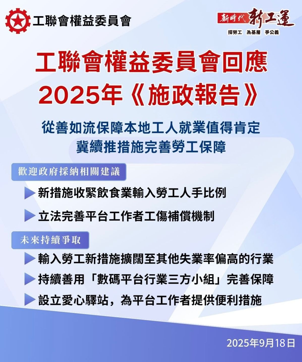 2025-09-18 工聯會權益委員會回應2025年《施政報告》:從善如流保障本地工人就業值得肯定 冀續推措施完善勞工保障