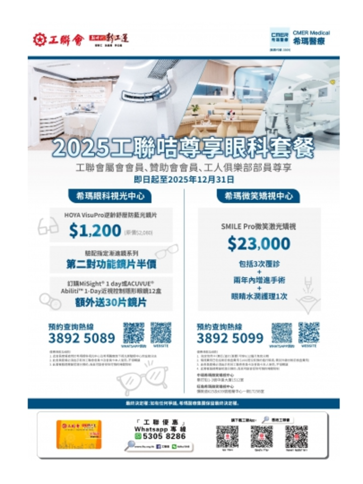 | 優惠條款細則 | 1. 此會員套餐適用於希瑪眼科視光中心及希瑪醫療旗下視光師驗眼中心的全線分店 2. 此會員套餐必須出示有效工聯會會員卡及會員卡本人使用,不得轉讓 3. 此套餐服務需提前進行預約,而且可能會受到可預約時間限制 4. 最終決定權: 如有任何爭議,希瑪醫療集團保留最終決定權。 |