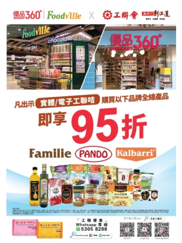 • 優惠期內,凡出示實體或電子工聯咭購買「Familie」、「PANDO」或「Kalbarri」三大品牌的全線產品,即可享有95折優惠。