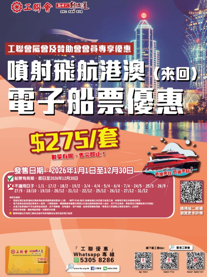工聯會於2026年繼續推出「 噴射飛航港澳(來回)電子船票優惠」,會員只需以每套$275的價錢,就可以購買一套總值高達 $440、往返香港<—>澳門的噴射飛航(TurboJet) 電子船票,船票適用於周六、日的日夜航班次(個別日子除外,詳情請參閱「船票有效期」)
