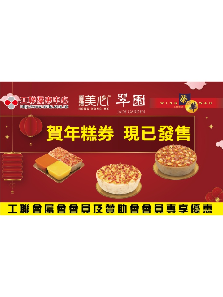 - 於各工聯優惠中心憑有效工聯咭,即可以「會員價」購買以下榮華、美心以及翠園等集團的糕劵*,與親朋好友共賀新年!